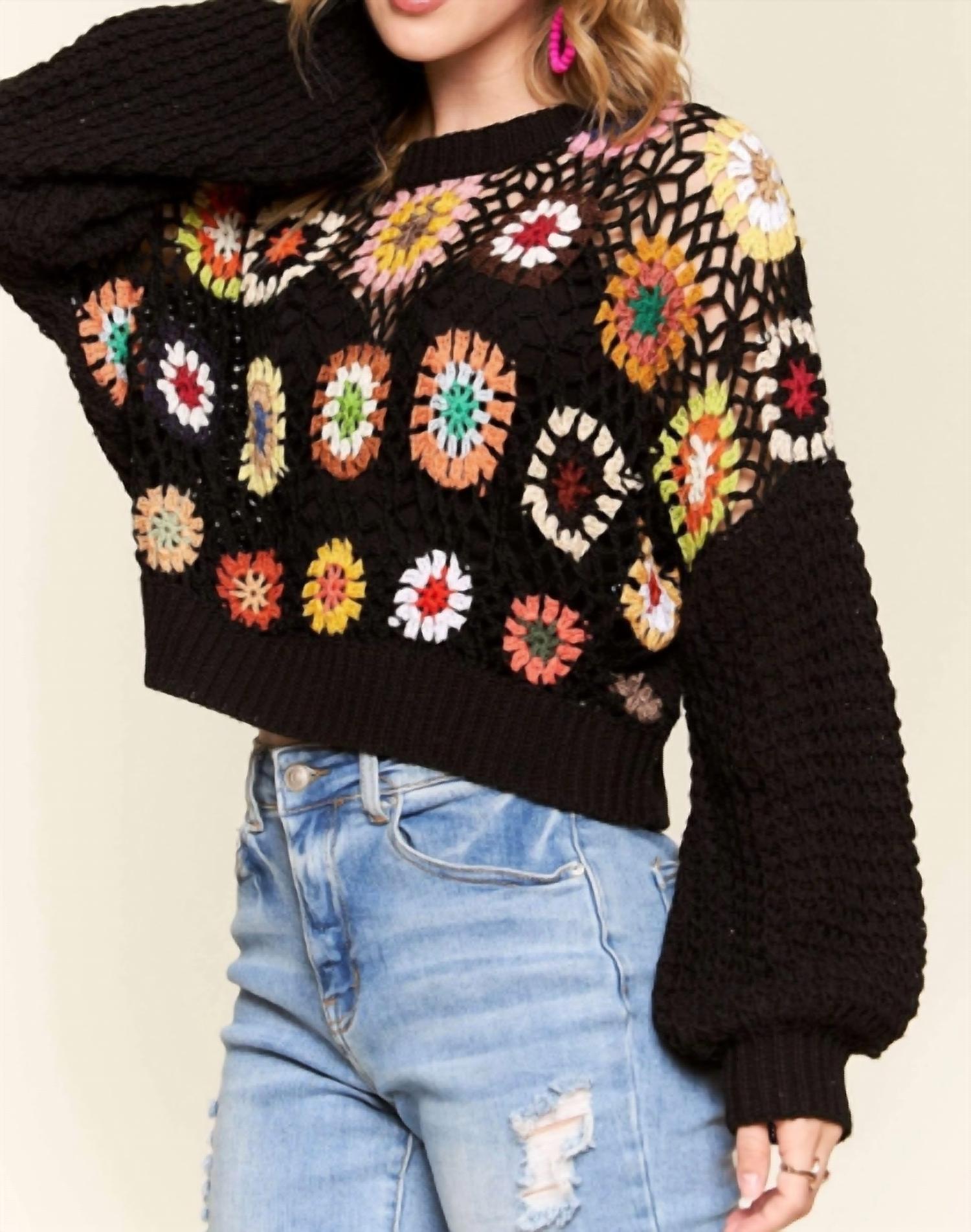 Unveil a vibrant addition to your fall wardrobe with the Crochet Crop Sweater Knit Top by ADORA. This women's long sleeve top in a multicolor pattern offers a casual cropped fit that aligns with the boho chic trend. Made from 100% polyester, it beautifully showcases random sewn patterns for a unique look. Designed with a crewneck and a convenient pull-on closure, this sweater transitions seamlessly from Thanksgiving gatherings to travel adventures.