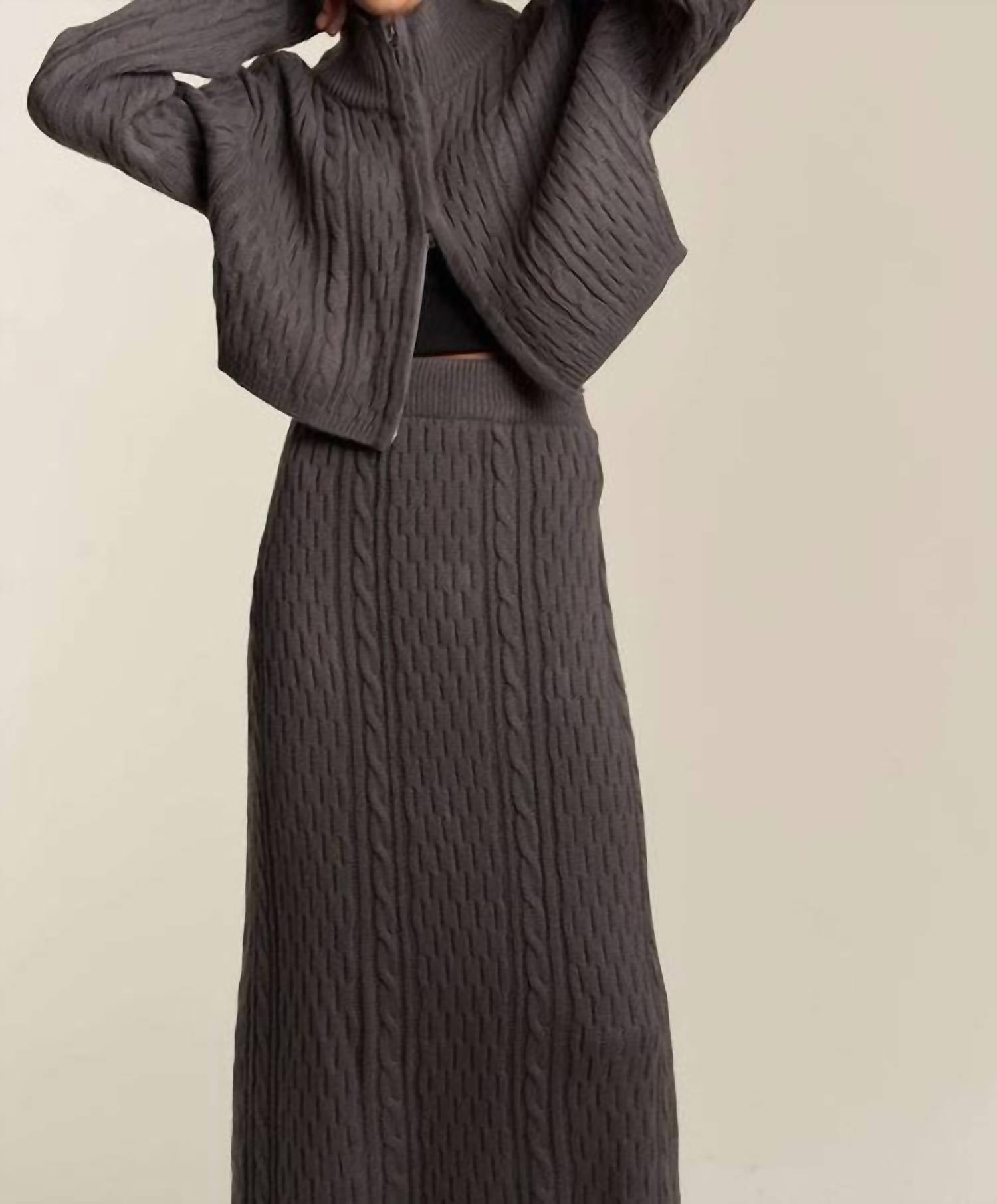 Elevate your fall wardrobe with the ADORA Women's Edna Textured Knit Sweater Set, a minimalist ensemble in chic grey. This set features a zip-up cropped cardigan and a flowing maxi skirt, both crafted from 100% acrylic for cozy comfort. Closure: Pull on. Ideal for vacation occasions, this set combines style and ease.