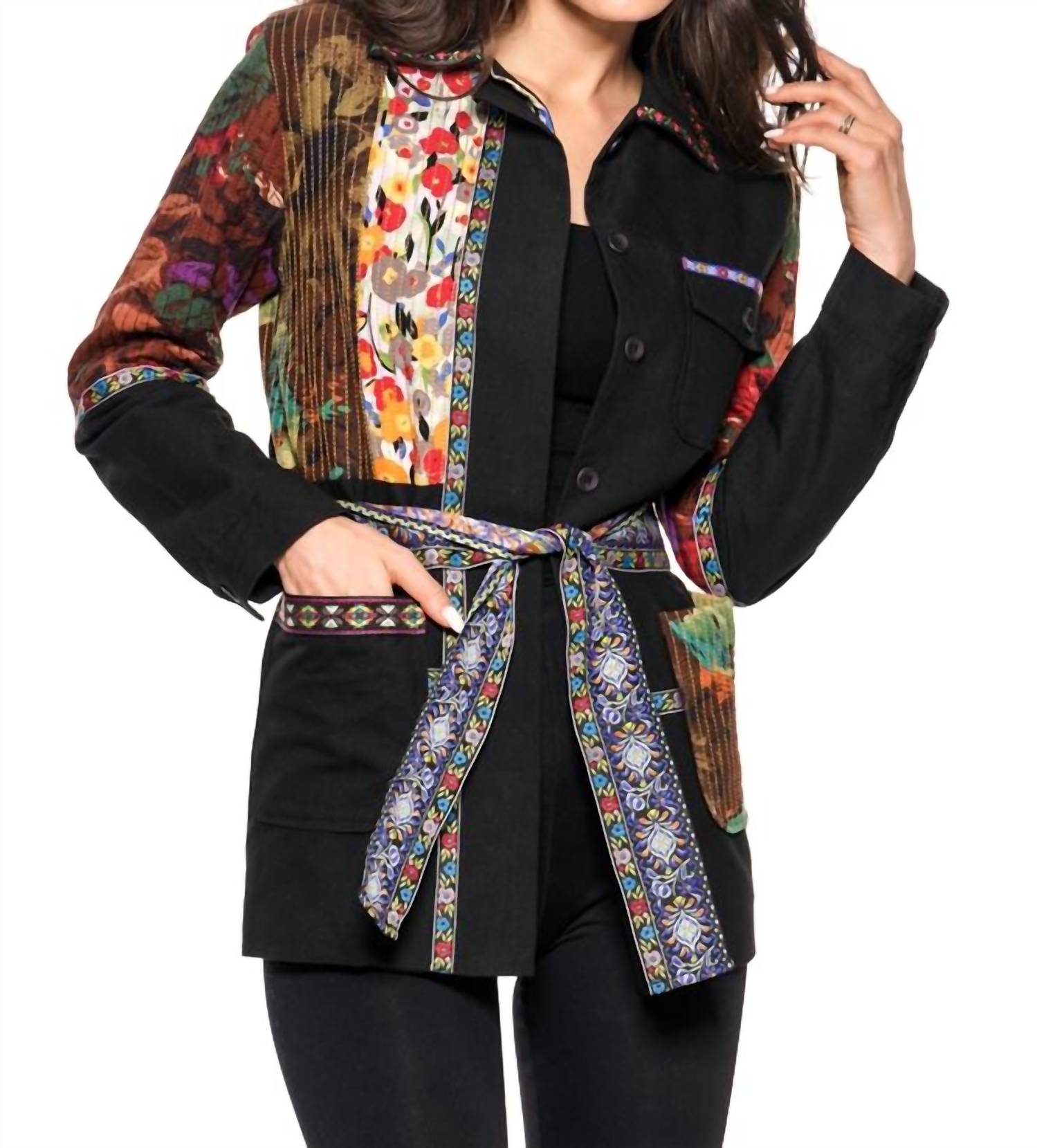 Meet the Belted Mix Media Jacket by Adore, a statement piece in black with vibrant floral prints and embroidered panels. This casual women's jacket features long sleeves and a collared neckline, cinched with a matching patterned belt for an adjustable fit. Crafted with attention to detail, it includes buttoned cuffs and front patch pockets for added structure and functionality. Made in China, this jacket closes with buttons and requires hand washing for maintenance.