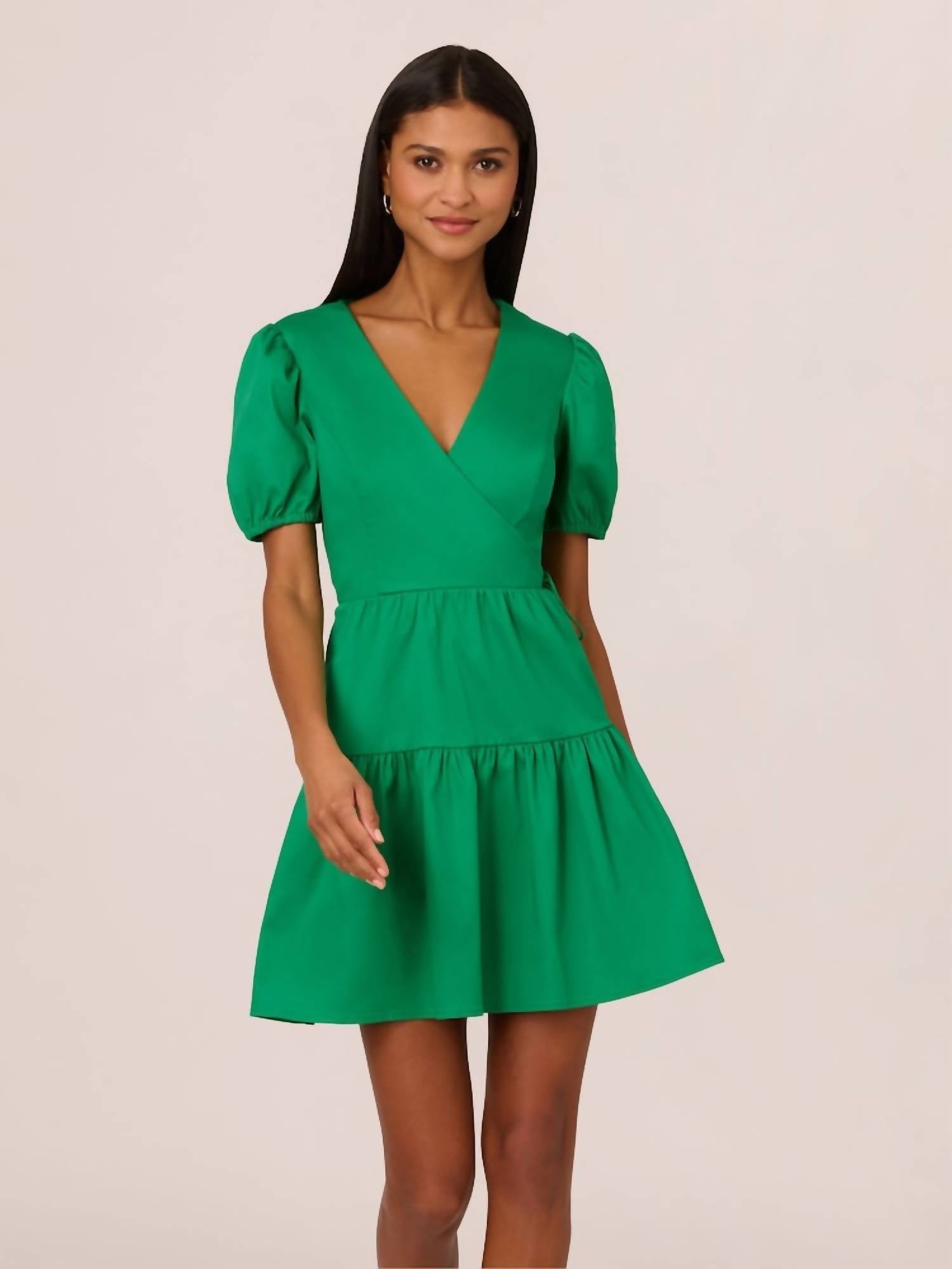 The kind of easy and flattering dress you'll be reaching for all season long. Perfect for sunny days or evenings out, this short-sleeved dress features a surplice V-neck bodice, puffed sleeves, and a tiered skirt enhanced with shirred detailing. Crafted from a soft stretch cotton blend, it includes a tie accent and an elastic waistband, making it an easy pull-on style that stays comfortable all day. Whether paired with casual mules or dressed up with metallic heels, this flirty tiered design offers versatile charm. Made from 98% cotton and 2% elastane.
