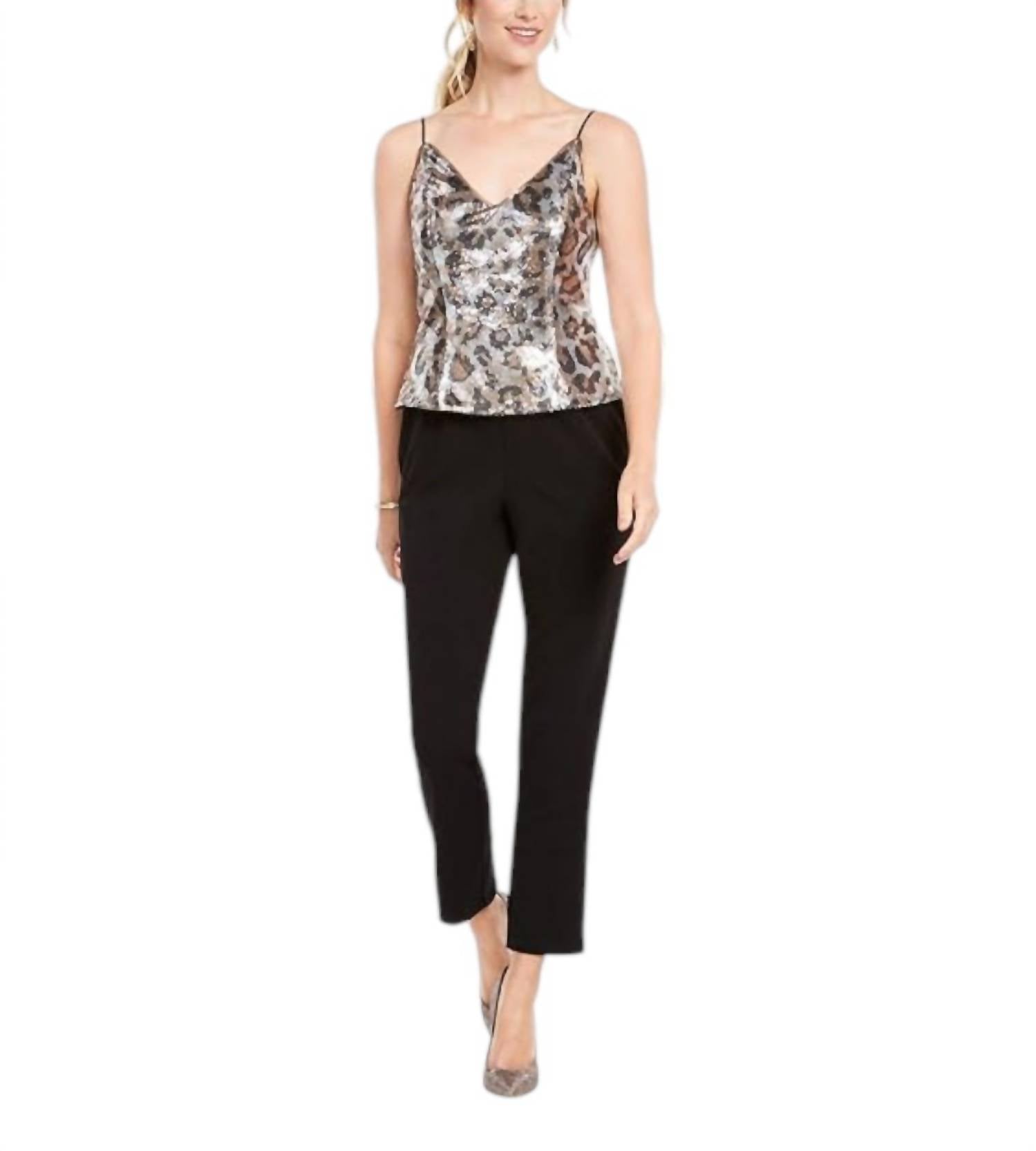 Elevate your evening ensemble with the Adrianna Papell Spaghetti Strap Popover Jumpsuit in a chic beige and black animal print. Crafted from premium polyester, this sophisticated jumpsuit features adjustable spaghetti straps for a personalized fit and a stylish V-neckline. Its sleek zip closure ensures an impeccable silhouette with a combination of sequin mesh and crepe fabric, tailored for elegance and movement. Care is simple with hand wash instructions, making it easy to keep your look flawless for any formal summer event.