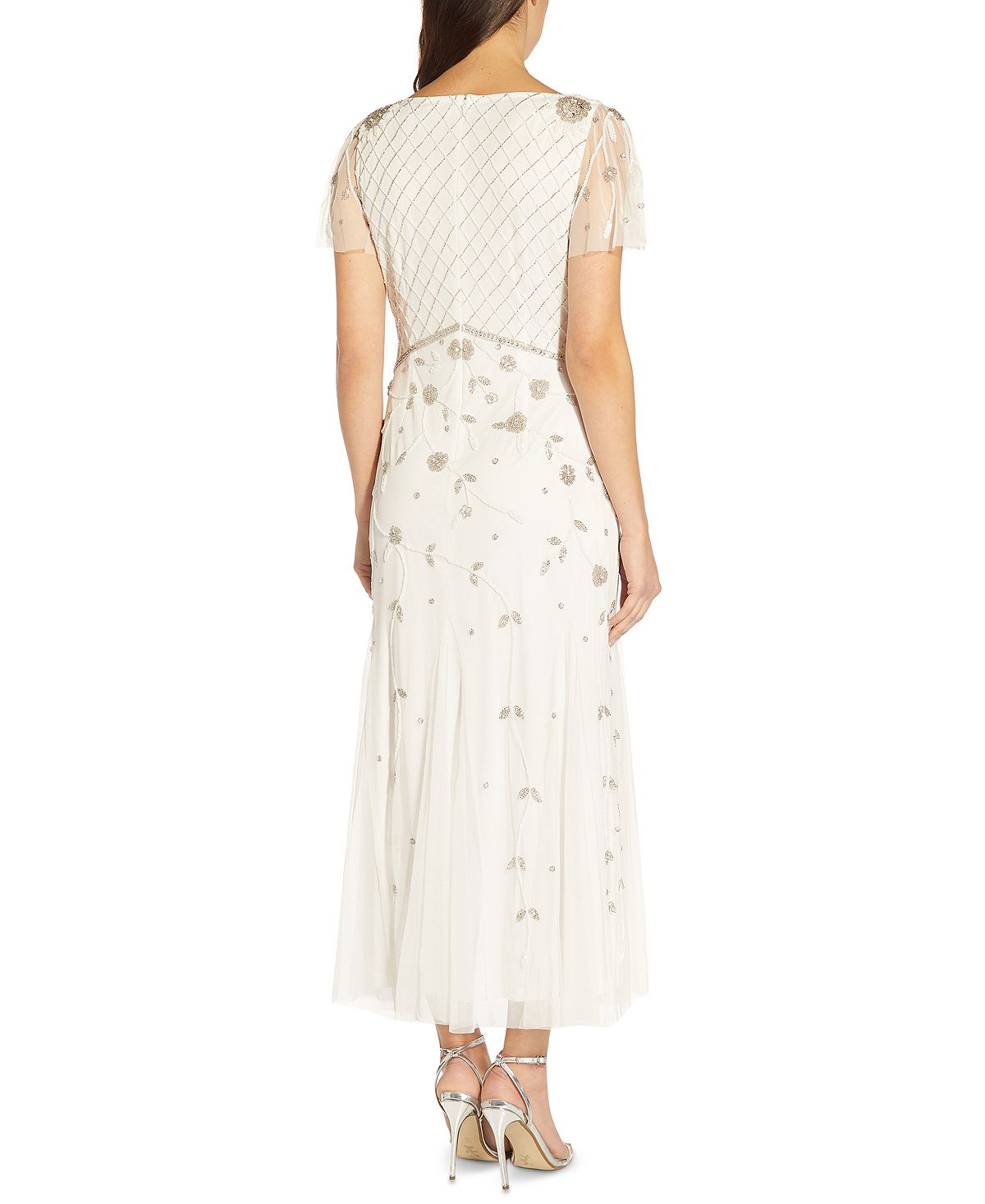 Toques de moda vintage se unem para um visual deslumbrantemente detalhado neste vestido com contas de Adrianna Papell. | Aproximadamente 13,5 cm de comprimento, do centro do decote até a barra. O comprimento varia 1/4 entre os tamanhos | Decote em V | Fecho de zíper invisível nas costas | Mangas curtas esvoaçantes | Estampa de contas em toda a peça; golas na saia | Forrado
