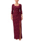Um padrão de veludo queimado confere um belo acabamento a este vestido de gola quadrada da Adrianna Papell. | Aproximadamente 61 cm de comprimento, do centro do pescoço até a bainha. O comprimento varia 1/4 entre os tamanhos. | Vestido formal longo | Decote quadrado; Silhueta do vestido | Zíper invisível nas costas | Franzido no corpete; fenda na frente | Franzido na frente e nas costas