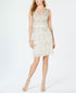 Aproximadamente 31-1/4 de comprimento do centro das costas até a bainha. O comprimento é baseado no tamanho 4 e varia 1/4 entre os tamanhos | Decote em V; corte em A | Fecho de zíper nas costas | Contas por toda a peça; lantejoulas e pérolas artificiais; babado em camadas na saia | Bordado à mão