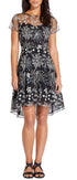 Adrianna Papell apostou em detalhes bonitos para um visual elegante com este vestido bordado com decote ilusão transparente e bainha alta e baixa sutil. | Decote ilusão e mangas curtas; bainha alta e baixa | Fecho de zíper nas costas; fecho de botão nas costas com decote em forma de fechadura | Forrado | Decote redondo | Importado |