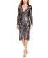 Aproximadamente 112 cm de comprimento, do centro do decote até a bainha. O comprimento é baseado no tamanho 4 e varia 6 mm entre os tamanhos. | Decote em V; silhueta falsa envolvente | Zíper traseiro oculto com fecho de colchete | Drapeado na cintura; ombreiras; comprimento midi; acabamento em tecido metálico prateado | OBSERVAÇÃO IMPORTANTE: Este item chega com uma etiqueta de devolução anexada e instruções para remoção. Após a remoção da etiqueta do vestido, este item não poderá ser devolvido.