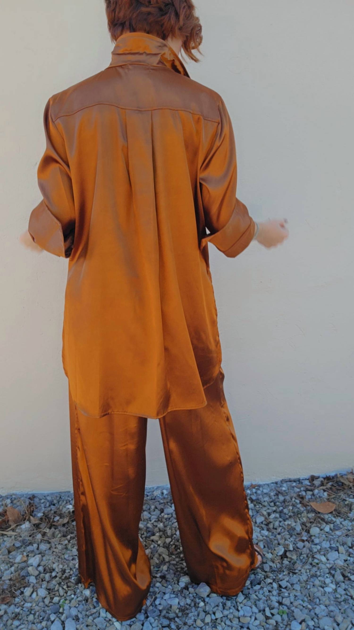 The Women's High Low Button Down Blouse by ADRIENNE in a captivating Copper shade is your perfect springtime essential. With long sleeves featuring roll tabs, this top combines a relaxed draped silhouette with an ultra-smooth satin finish that gracefully skims the body. Its breathable and lightweight design, complemented by a gold tone, effortlessly enhances all skin tones while adding a hint of warmth to any outfit. Closure: Button closure.