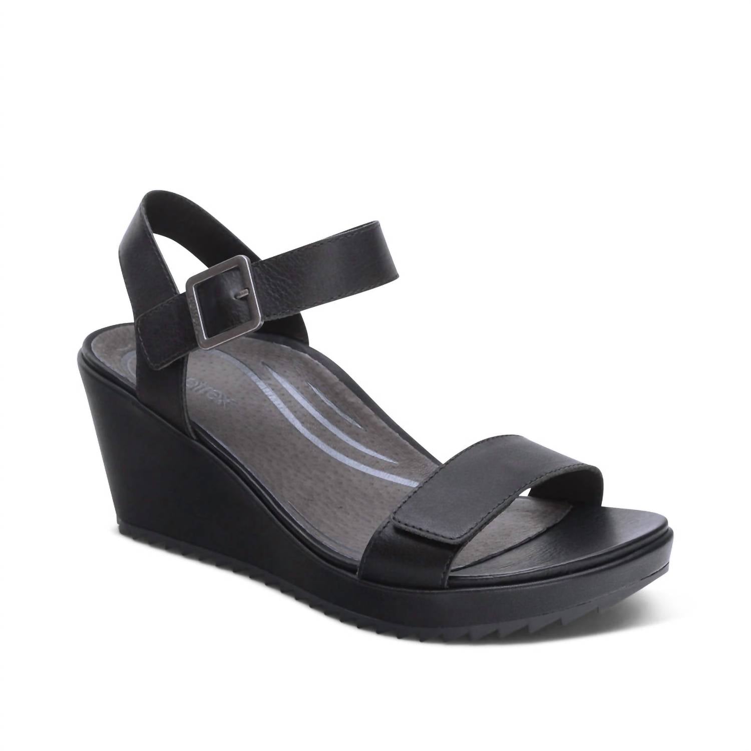 Elevate your footwear game with these adorable wedges. Step into summer with the Andrea Wedge Sandal by Aetrex, a women's shoe designed for both elegance and comfort. Featuring a 2.75" mid wedge heel, these sandals offer an open toe style perfect for dinner parties and Thanksgiving gatherings. Crafted with a leather upper and footbed, the sandals boast a molded, contoured insole for everyday support, with rubberized EVA midsole and leather lining. With an adjustable quarter strap featuring hook & loop closures, they provide a snug fit ideal for regular to wide widths, making them an excellent choice for summer workwear occasions.