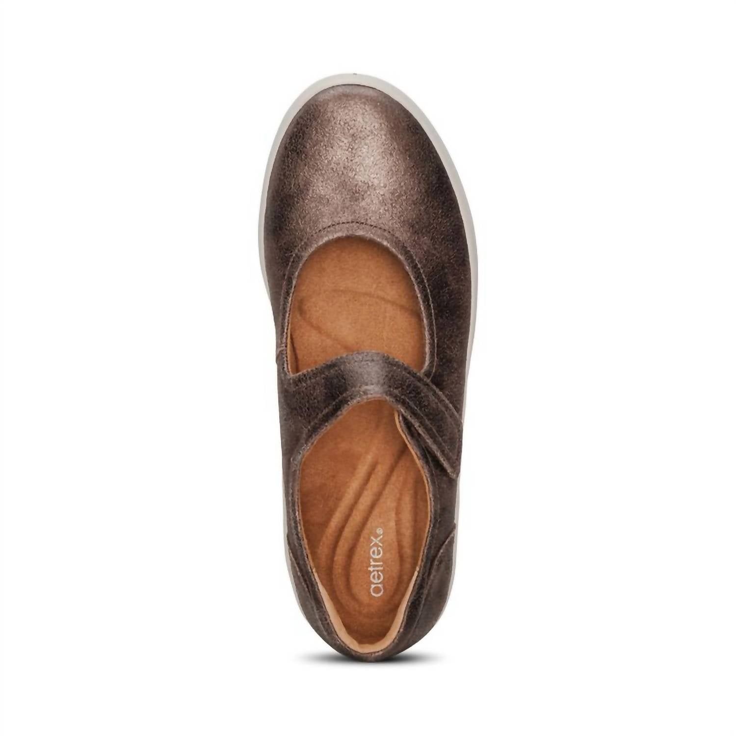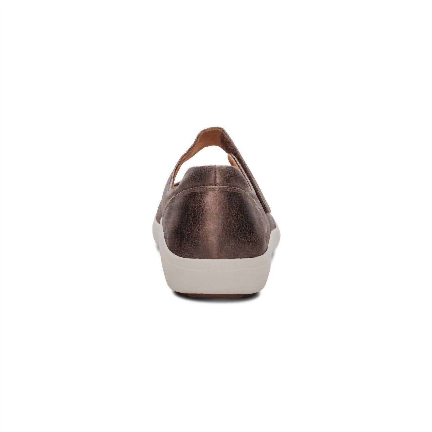 Os tênis Erica da Aetrex combinam estilo casual com conforto para o dia a dia. Inspirados no design Mary Jane, estes tênis bronze apresentam uma tira ajustável de velcro para um ajuste seguro. O cabedal em couro, a entressola leve em espuma EVA e o solado de borracha proporcionam durabilidade e estabilidade. Com salto de 3,1 cm e sistema ortopédico Aetrex integrado, eles oferecem suporte para o arco do pé e alívio de pressão para uma ótima usabilidade.