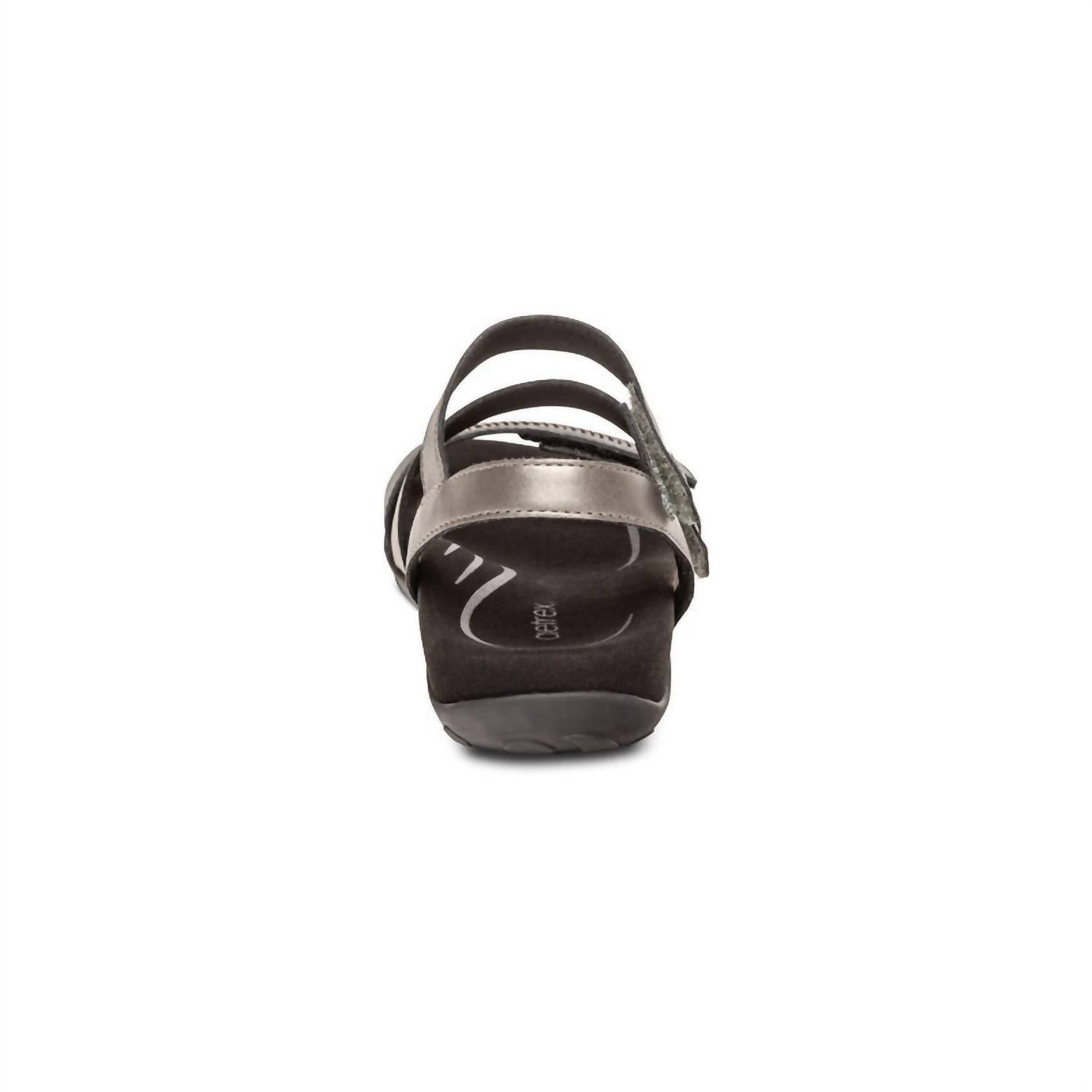 Possui tira lateral totalmente ajustável. Sistema ortopédico Aetrex. Fechos de velcro. Cabedal em couro sintético. Entressola em espuma viscoelástica. Palmilha em microfibra macia com tratamento antimicrobiano. Salto de 2,8 cm.