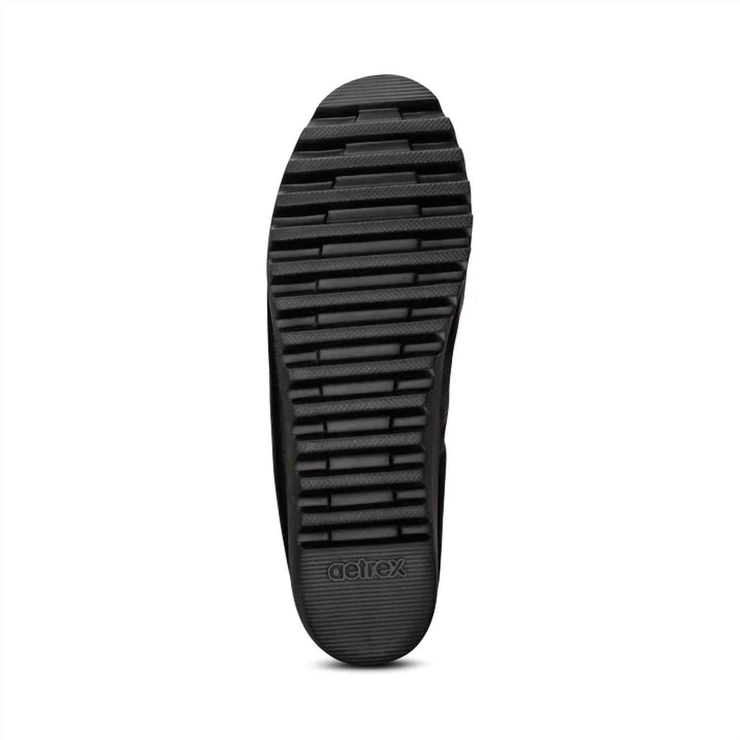 Apresenta cabedal em couro macio com elástico na parte superior para um ajuste perfeito e solado de borracha para maior durabilidade. Aproveite os benefícios do Sistema Ortopédico Aetrex integrado com palmilha de espuma viscoelástica com tecnologia SkyLite, proporcionando suporte essencial para o arco do pé e alívio das dores comuns nos pés. Calce este elegante mocassim preto com bico amendoado e salto modesto de 4 cm, perfeito para uso diário.