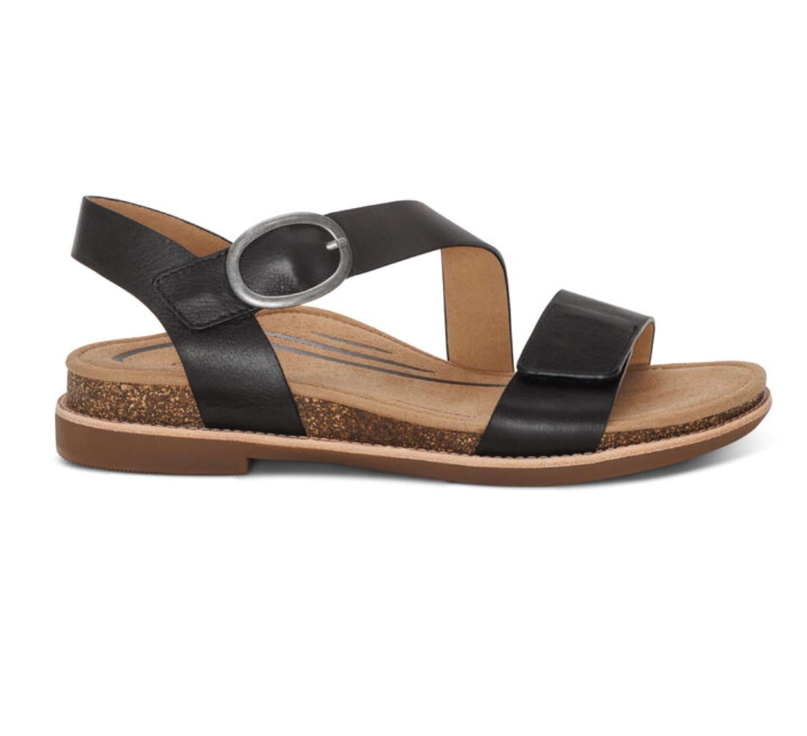 Suporte para o arco do pé. Palmilha de espuma viscoelástica. Tira assimétrica em formato de um quarto. Fecho de velcro. Cabedal em couro legítimo. Amortecimento e suporte o dia todo.