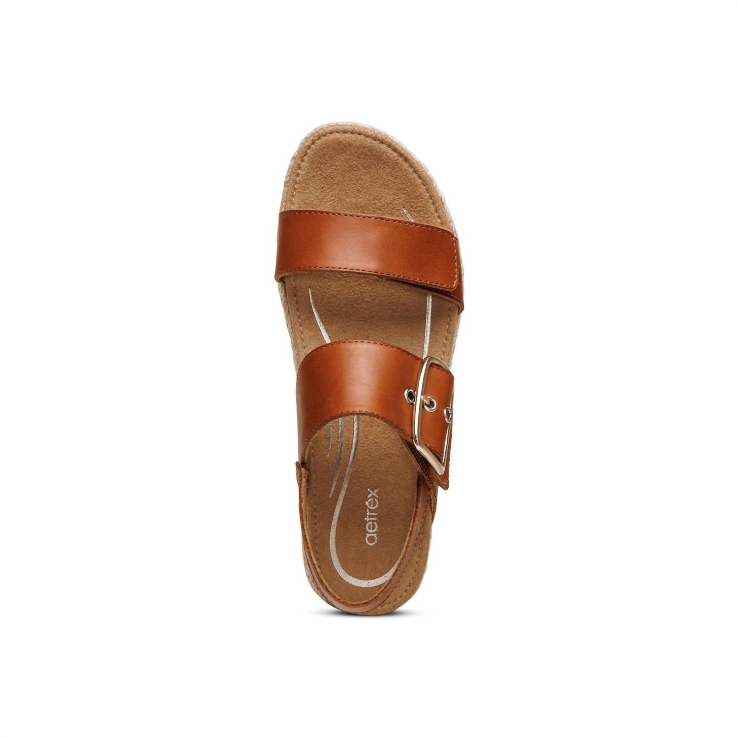 This sandal will take you from brunch to dinner and everything in between. Elevate your summer style with the Women's Vania Arch Support Platform Sandal in cognac by Aetrex, perfect for vacation and Mother's Day celebrations. These minimalist sandals feature a wedge heel style with a 2" heel height, combining chic design with comfort. The genuine leather upper is paired with adjustable hook-and-loop closures and stretchy gore material for a customized fit, while the memory foam and ultra-light cork midsole provides superior cushioning. The footbed boasts a soft microfiber lining treated with antimicrobial technology for odor control, and the blown rubber outsole ensures lightweight comfort.