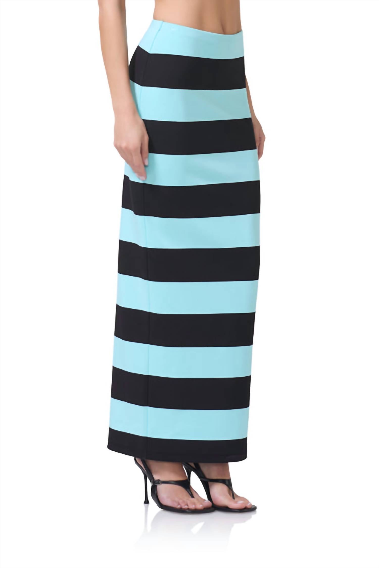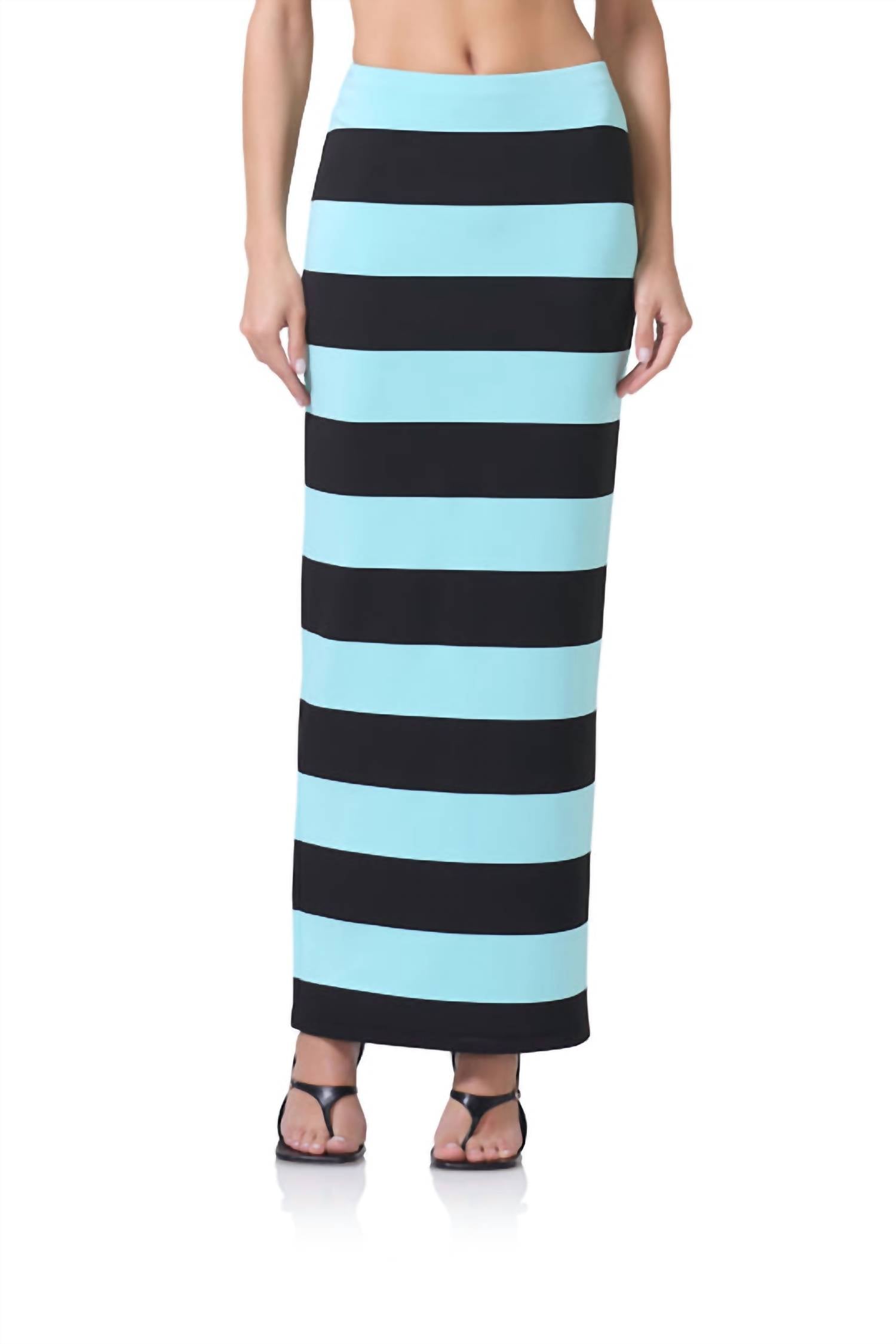 Discover the Franny Skirt by AFRM, a chic column silhouette perfect for your summer beach days. This maxi-length skirt features an encased elastic waistband for a fitted bodycon waist, effortlessly slipping on with its pull-on closure. It's crafted from scuba fabric comprising 52% Polyester, 43% Rayon, and 5% Spandex, offering a comfortable stretch in a trendy resort stripe pattern. Imported from China, this unlined beauty is easy to care for with a machine wash cold on a gentle cycle and should be laid flat to dry, without bleaching.
