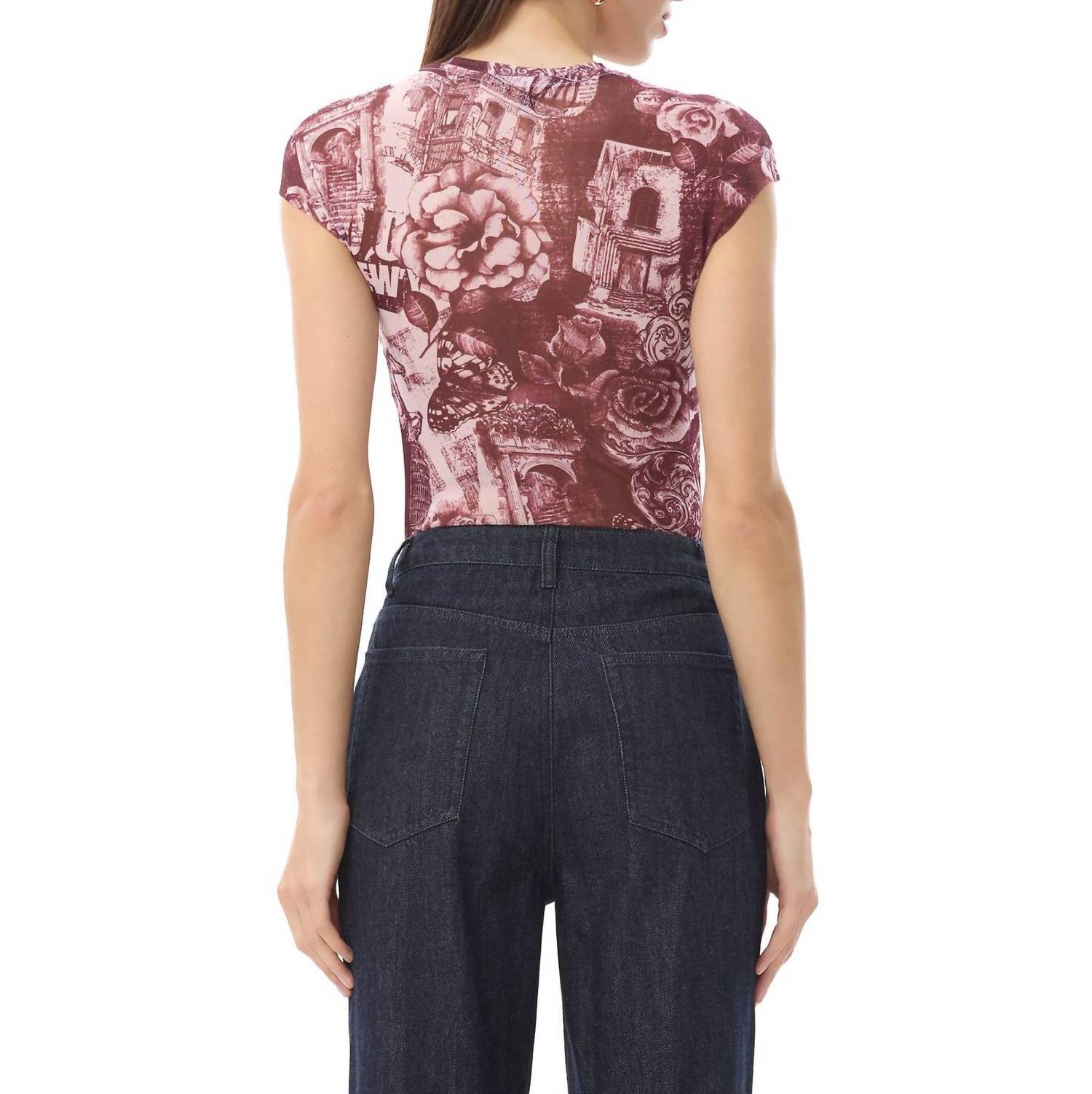 This imported fitted top, in the "Rose Convo" pattern, is made from a mesh blend of 95% Polyester and 5% Spandex. It features a T-shirt shape with cap sleeves, drop shoulders, and is an unlined, pull-on style.