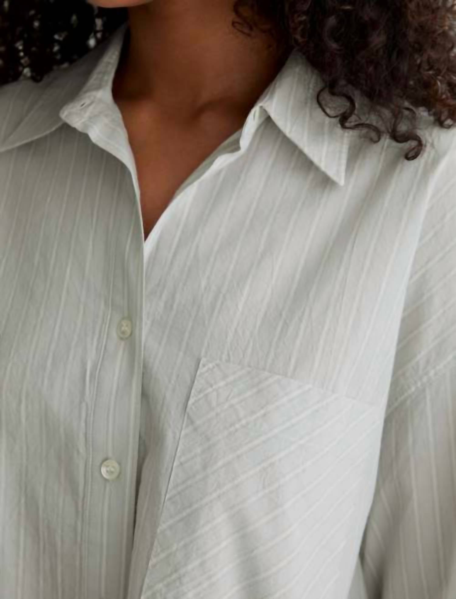 This button down shirt is comfortable yet polished. Introducing the Kellan Relaxed Crop Shirt by AG Jeans, a must-have for effortless spring style. This long sleeve shirt is crafted from 100% cotton, offering a crisp, breathable feel. With a stylish strip sea fog pattern, it features a button closure and convenient pockets. The cropped, boxy silhouette measures 23" in body length and 25" in chest width, with 20" sleeves, and it is machine washable for easy care, making it perfect for minimalist trends and dinner parties.