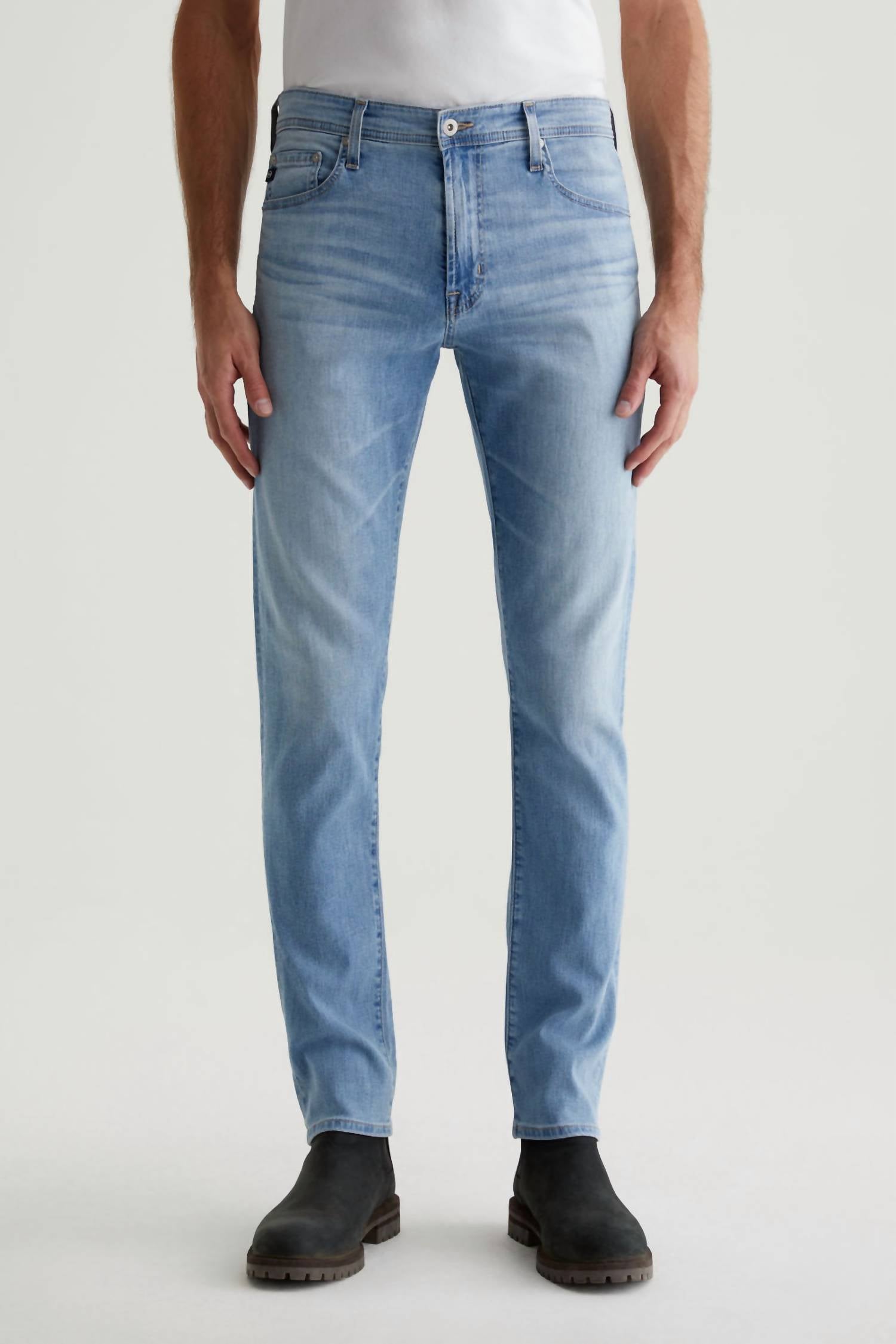 Introducing the Tellis Modern Slim Jean in Laurel by AG Jeans, a stylish choice for the modern man. These slim-fit jeans feature a mid-rise waist with a fitted upper block and straight leg style, enhanced by a light-wash solid pattern. Crafted from Airluxe™ Aerial Nylon Denim, it's composed of 73% Cotton, 25% Polyamide, and 2% Polyester, ensuring comfort and durability. Closure: Zip closure. Measurements include a front rise of 10", knee opening of 16 1/2", bottom opening of 14", and an inseam of 34". Care: Machine wash and tumble dry. Ideal for spring occasions like dinner parties or Thanksgiving celebrations. Model is wearing size 32.