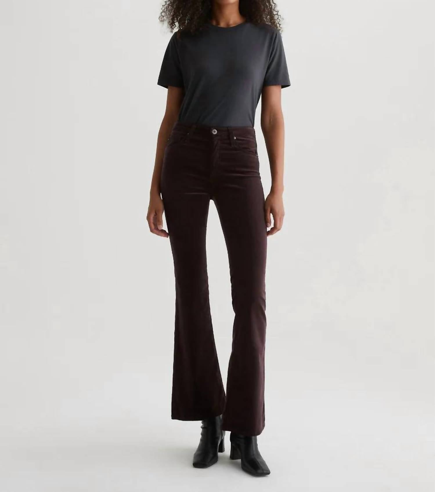 A flattering silhouette that's suprisingly versatile. Discover the Velvet Farrah Boot Mid Rise Jeans by AG Jeans, designed in a sophisticated Amaretto Noir. These mid-rise jeans, tailored for women, feature a flared leg style with a skinny fit through the leg and a subtly flared hem. Crafted from a soft plush stretch velvet, the composition includes a 70% Cotton, 28% Viscose Rayon, and 2% Spandex blend, providing both comfort and a luxurious feel. Closure: Zip closure; Care: Machine wash, lay flat to dry. Measurements: Front rise - 10", knee opening - 14", bottom opening - 18 1/2", inseam - 32". Model is wearing a size 25, ideal for minimalist trends and perfect for a special dinner party in the spring season.