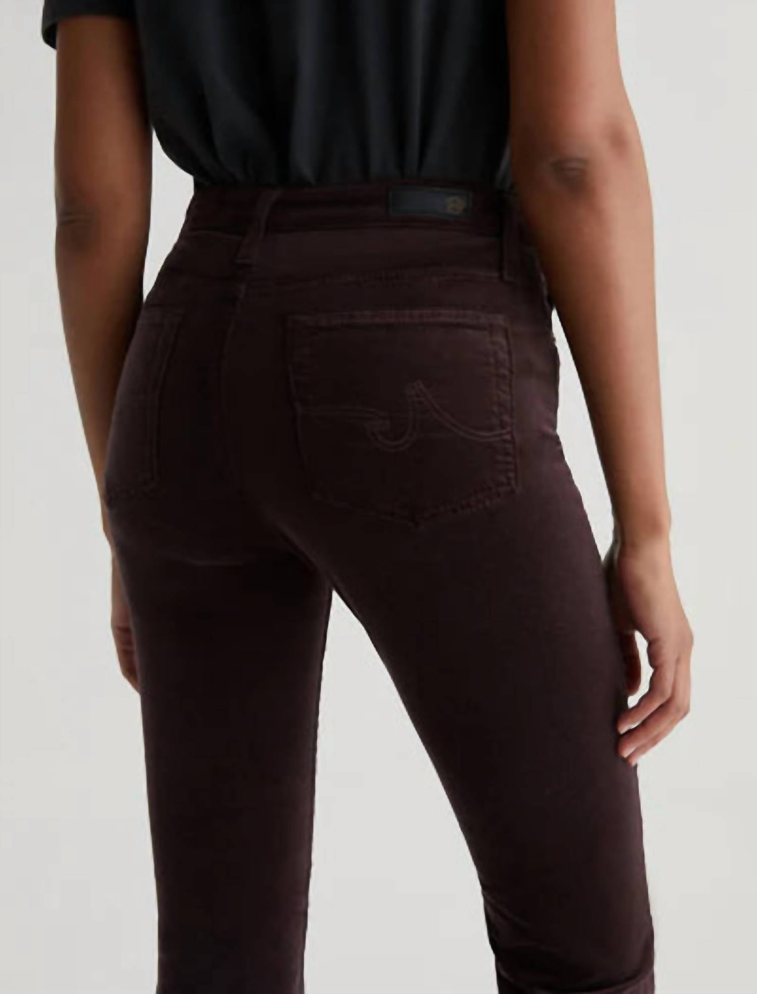Discover the Velvet Farrah Boot Mid Rise Jeans by AG Jeans, designed in a sophisticated Amaretto Noir. These mid-rise jeans, tailored for women, feature a flared leg style with a skinny fit through the leg and a subtly flared hem. Crafted from a soft plush stretch velvet, the composition includes a 70% Cotton, 28% Viscose Rayon, and 2% Spandex blend, providing both comfort and a luxurious feel. Closure: Zip closure; Care: Machine wash, lay flat to dry. Measurements: Front rise - 10", knee opening - 14", bottom opening - 18 1/2", inseam - 32". Model is wearing a size 25, ideal for minimalist trends and perfect for a special dinner party in the spring season.