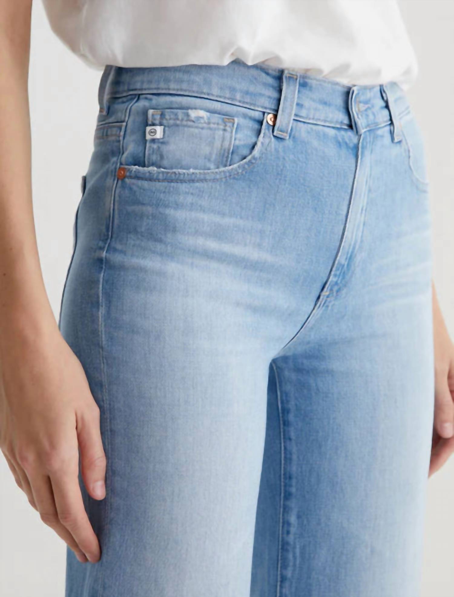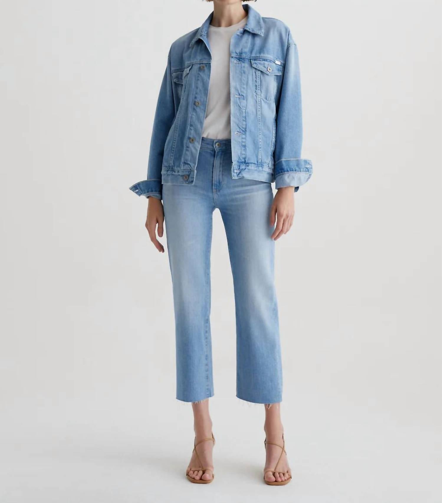 The Brinley Crop Jeans by AG Jeans offer a chic touch to your warm-weather wardrobe with a mid-rise waist and straight-leg silhouette. Crafted from Italian Journey Denim, these jeans boast a sleek medium wash with a hint of distressing. Designed with a zip closure and raw ankle-baring hems, the pants offer a casual yet sophisticated style. Care is simple with a machine wash for easy maintenance. Model is wearing a size 26, with dimensions: Front Rise 10 1/4", Knee Opening 17 1/4", Bottom Opening 16", Inseam 27".