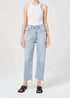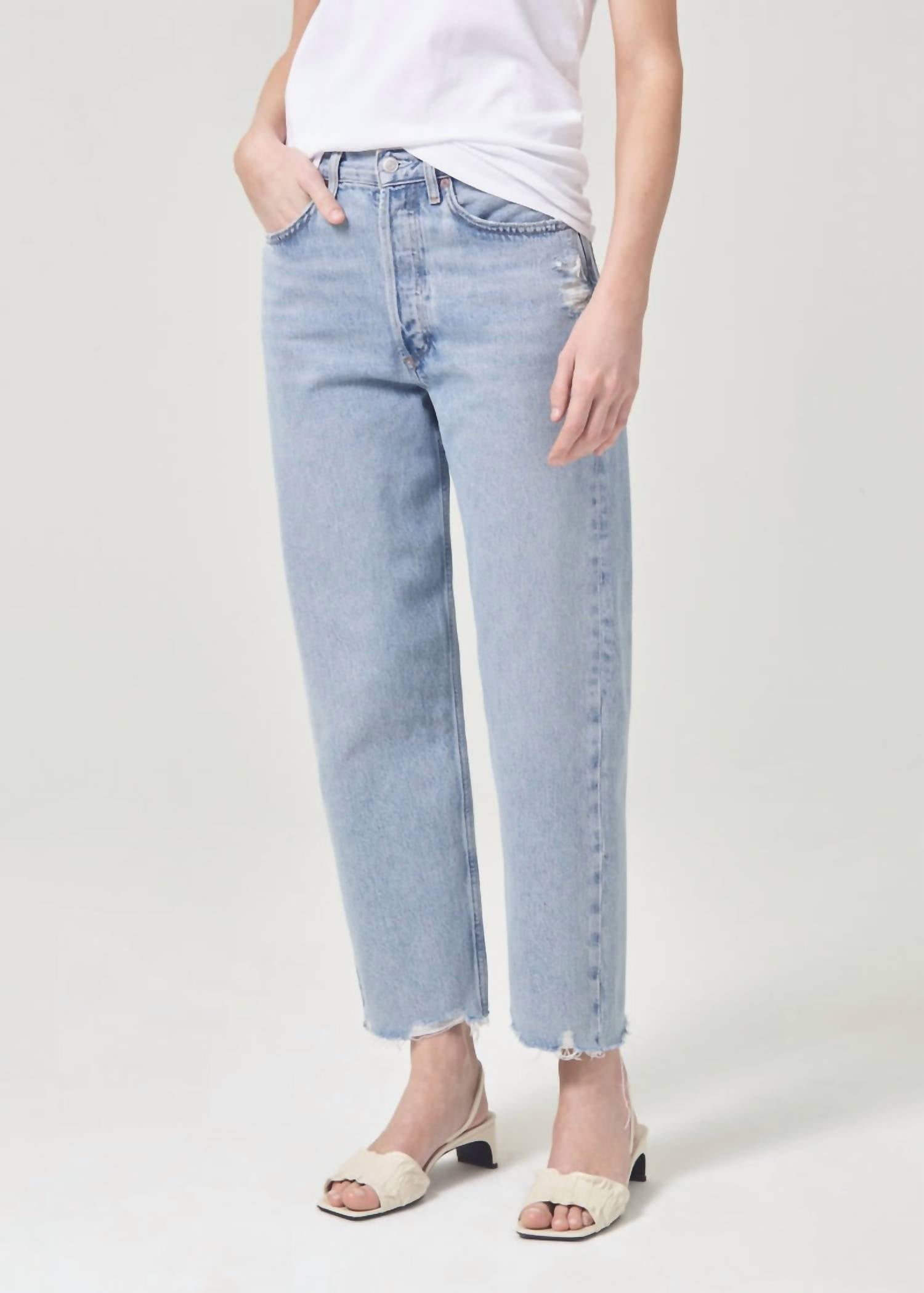 Meet the 90's Crop Mid Rise Straight Jeans by AGOLDE, a chic nod to nostalgic fashion in a light indigo wash. Crafted from 100% Organic Cotton, these jeans offer a relaxed fit that softens with wear. Featuring a mid-rise of 12 3/4" and a cropped 26" inseam, complemented by a classic straight leg with a 16" opening, these jeans close with a stylish button fly. Enjoy convenient machine wash care instructions, ensuring easy maintenance. The model is 5'10" and is wearing a size 27.
