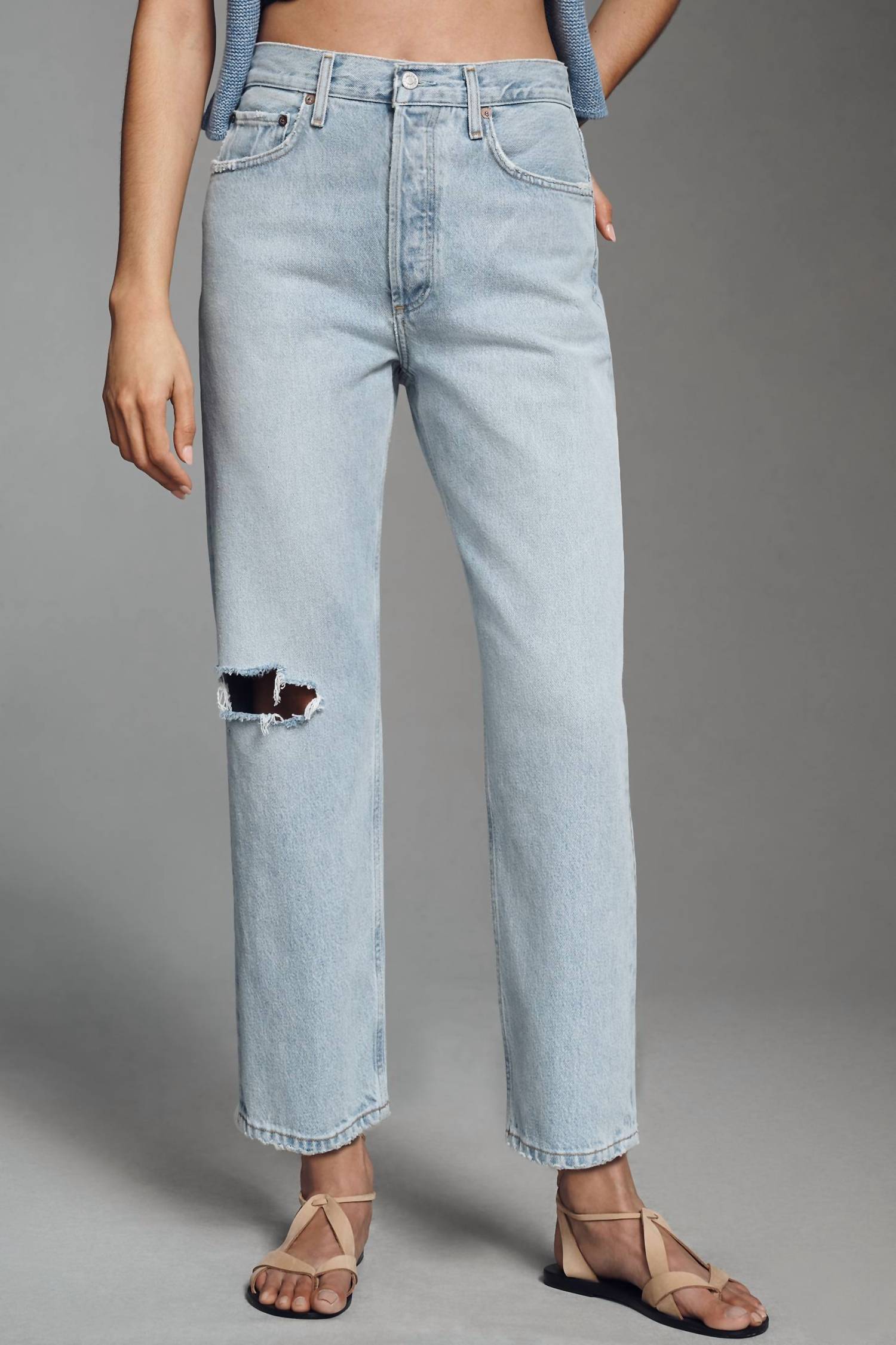 Step back into the 90s with the AGOLDE 90's Mid-Rise Loose Straight-Leg Jeans, crafted for a perfect blend of retro style and modern comfort. These jeans are made from premium denim and boast a straight-leg design with a flattering regular fit, ideal for a laid-back vacation look. Featuring a high-rise waist and button closure, they offer a timeless light wash that captures the essence of 90s fashion. Designed for women, these jeans include pockets for added functionality, making them a versatile staple for any spring wardrobe.
