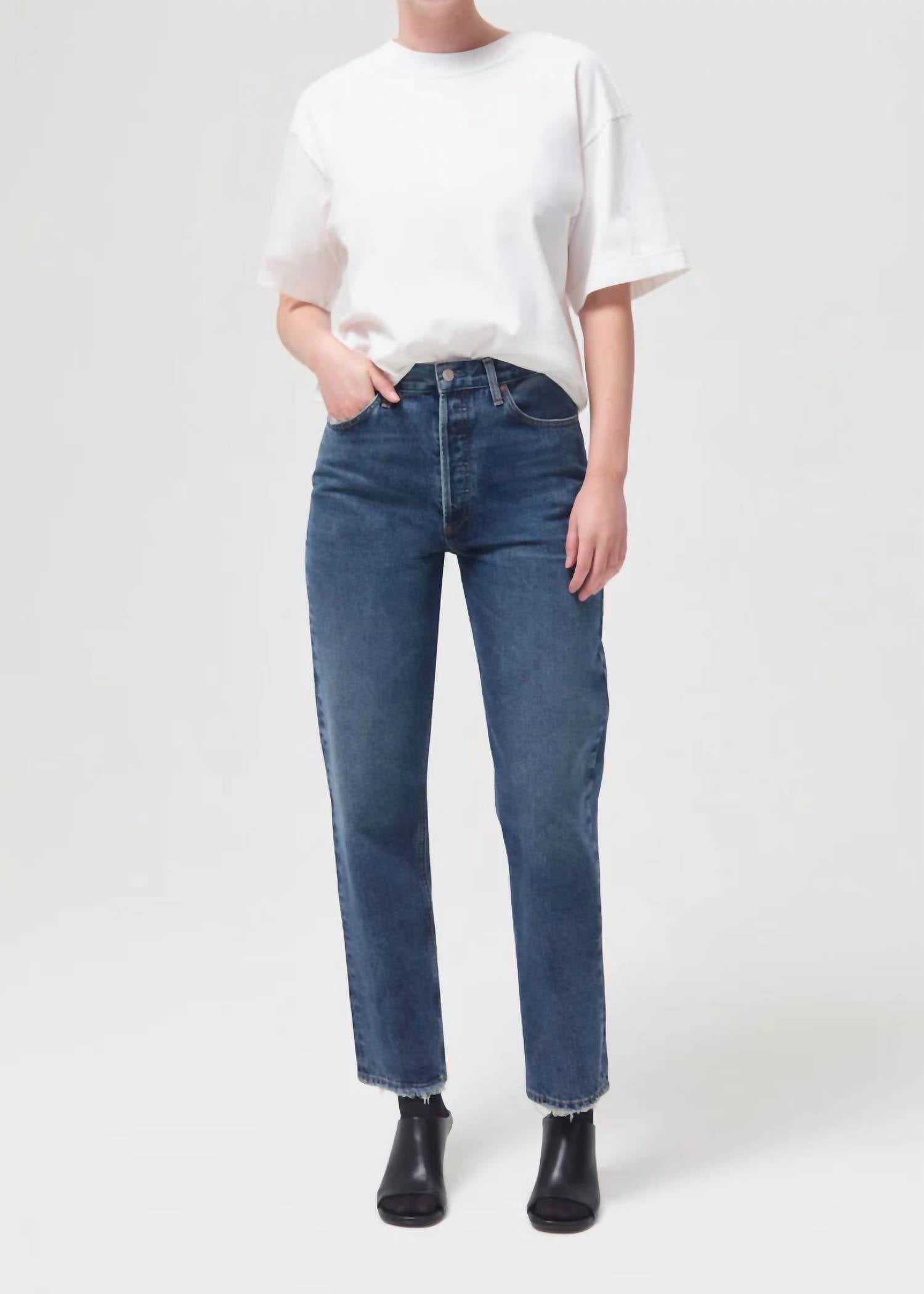 Meet the AGOLDE 90's Pinch Waist High Rise Straight Leg Jean in the captivating color Range, ideal for embracing the 90s fashion trend with a modern twist. Featuring a high-rise waist and slim fit, these jeans promise a flattering silhouette through the hips, enhanced by a classic straight leg cut. Crafted from 100% organic cotton, they present a medium wash with a distressed hem for a touch of vintage charm. Closure: Button fly. Care: Machine wash cold inside out with like colors, tumble dry low.