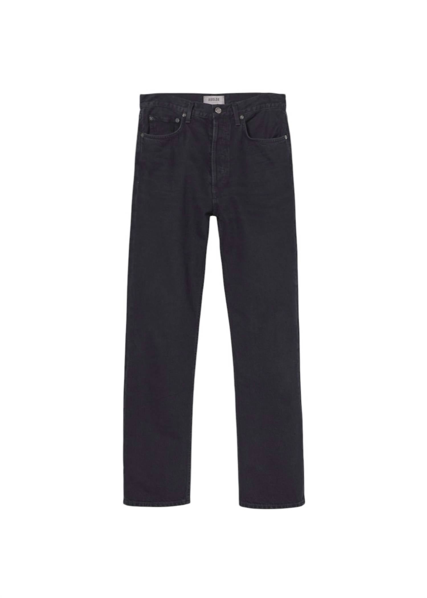 Discover the 90's Pinch Waist Jean by AGOLDE, where vintage style meets modern comfort. These jeans boast a high-rise waist with a 12.75-inch rise and a classic straight leg, finished with a full-length inseam of 29.5 inches. Made from 100% cotton denim, these jeans come in a deep, saturated crushed black that will only get softer with wear. With a button fly closure, manufactured in Turkey, these jeans are as stylish as they are durable. Care for them with machine wash cold instructions to maintain their vintage appeal.