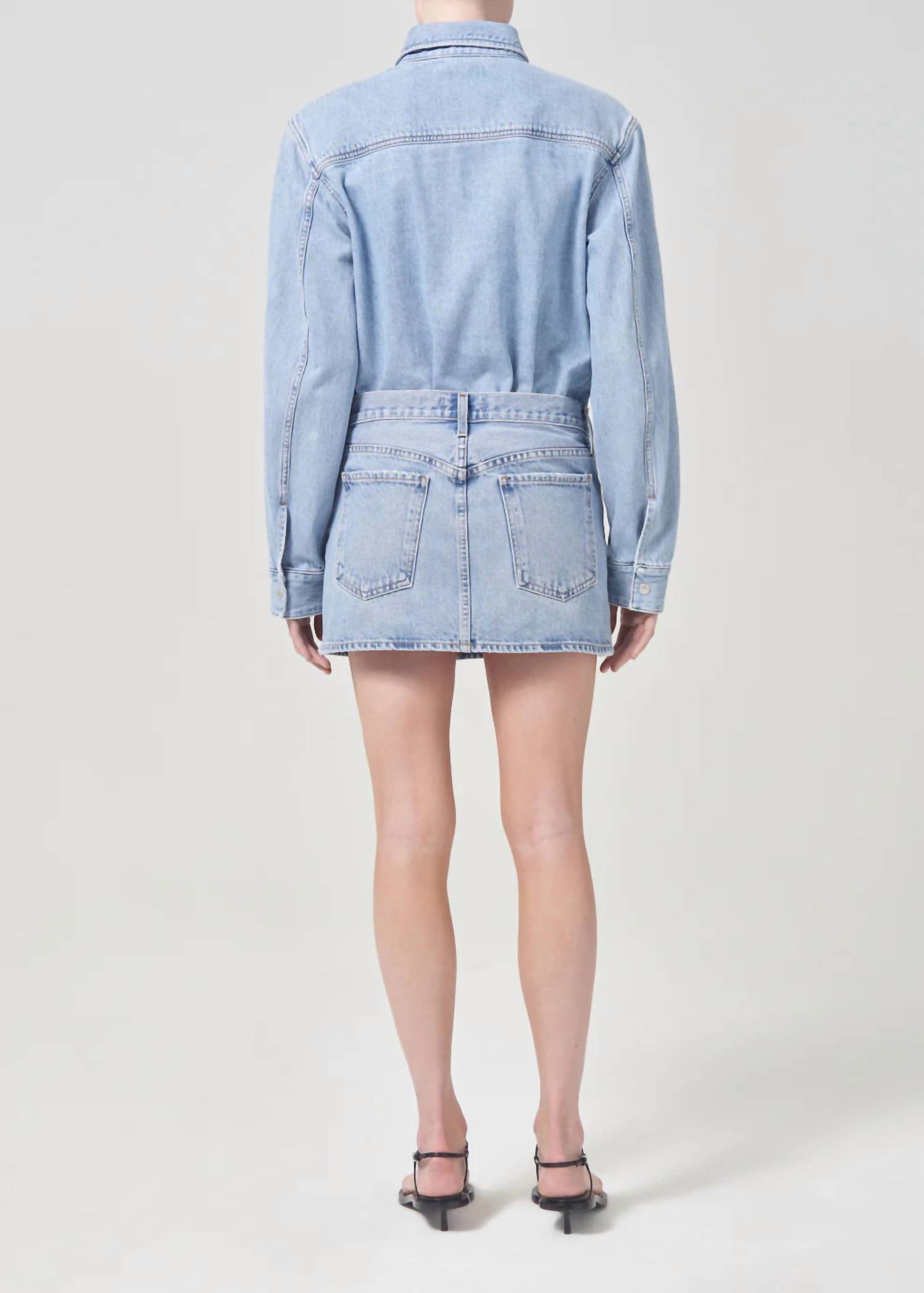 Introducing the Alek Mini Skirt in Force by AGOLDE, a chic addition to your summer wardrobe. With its classic 5-pocket design and button closure, this skirt is crafted from signature regenerative cotton, displaying a marbled light indigo shade with vintage fading and whiskering. The rigid, non-stretch cotton denim provides a soft touch for all-day comfort, while its mini length and clean, finished hem offer a trendy Y2K look. Ideal for pairing with a denim jacket for a stylish coordinated outfit or a simple tee and sneakers for a laid-back vibe, this piece is true to size and perfect for vacation getaways.