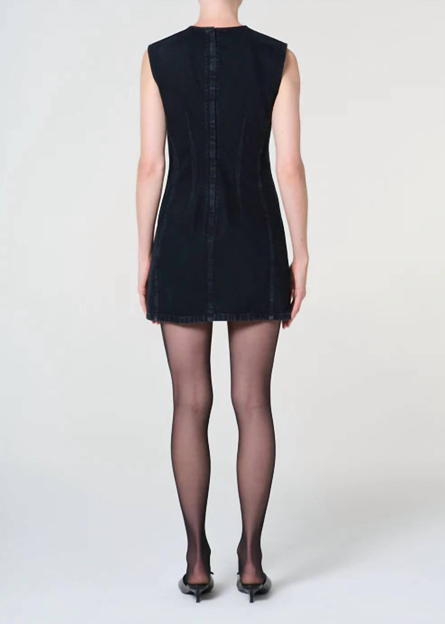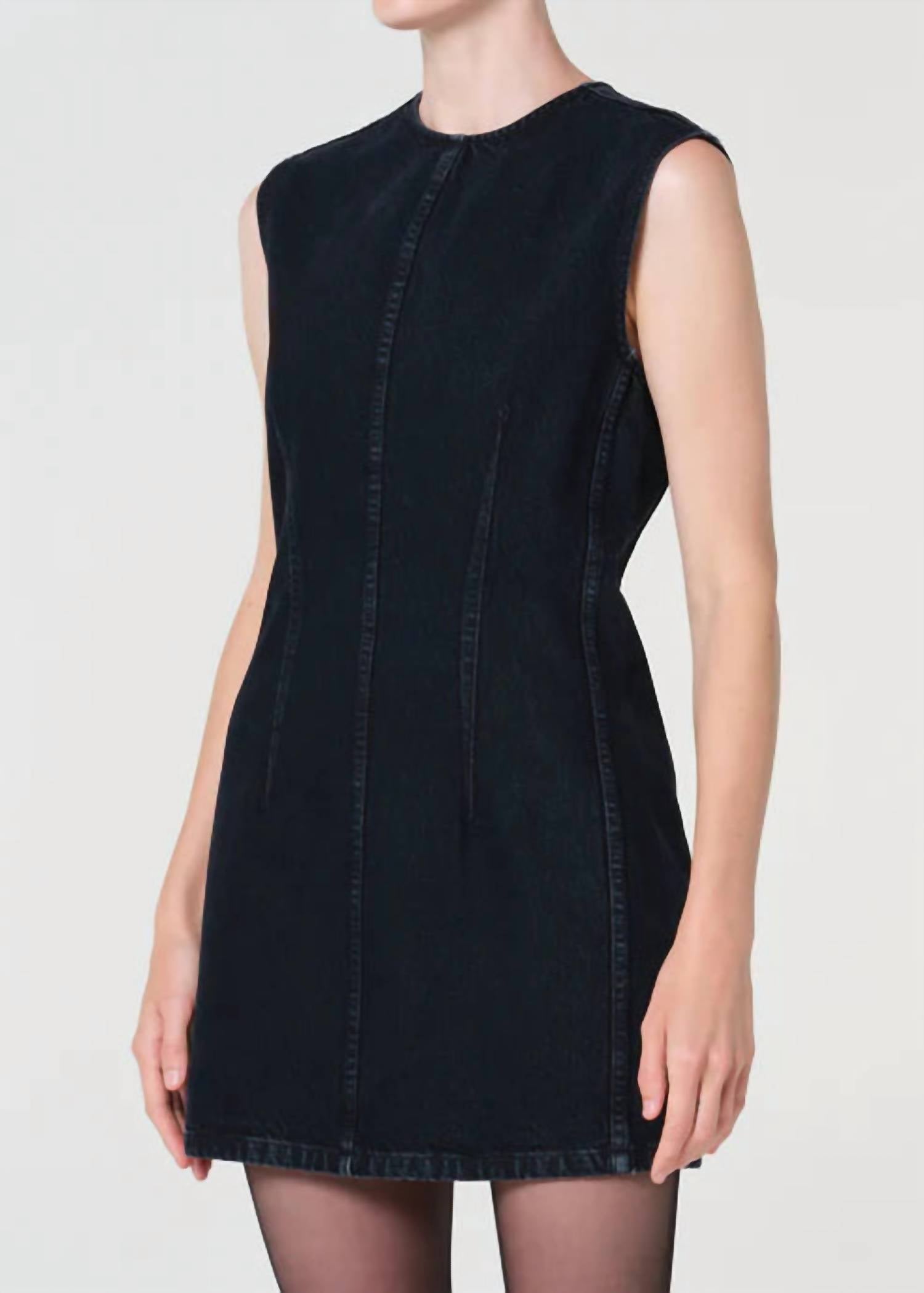 Introducing the Barton Mini Dress by AGOLDE, a sleek sheath silhouette perfect for minimalist style. This dress, crafted from 100% regenerative cotton, features a sleeveless tank design in a blackened blue indigo hue. With a relaxed straight fit, it's 33" in body length and has a chest measurement of 34 1/2". Made in Turkey, it offers a zip closure and is machine washable for easy care.