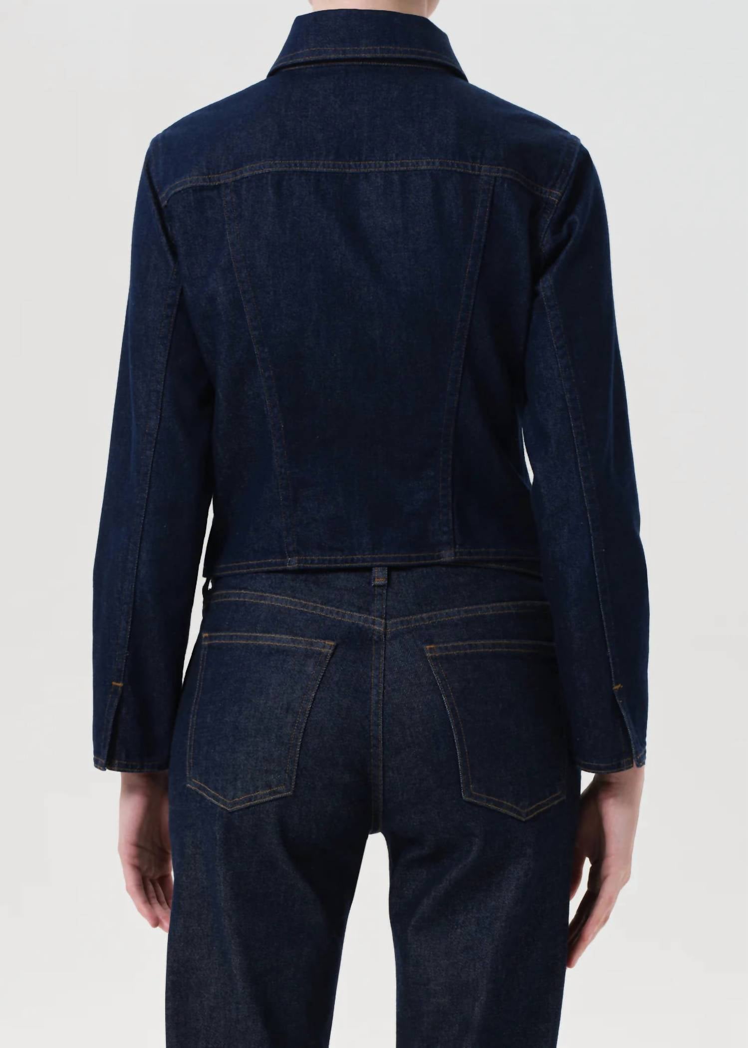 Cute, casual, and comfortable. This jacket is a must have. Introducing the AGOLDE Contoured Long Sleeve Jacket, a chic addition to any wardrobe with its flattering, fitted silhouette and shaping seams. Crafted from a sustainable blend of 80% regenerative cotton and 20% post-consumer recycled cotton, this casual jacket offers a polished look in a deep indigo rinse. It features a button closure for easy wear and is designed with convenience in mind with pockets included. Care instructions: Machine wash and tumble dry. Made for women, this imported piece effortlessly combines style and sustainability.