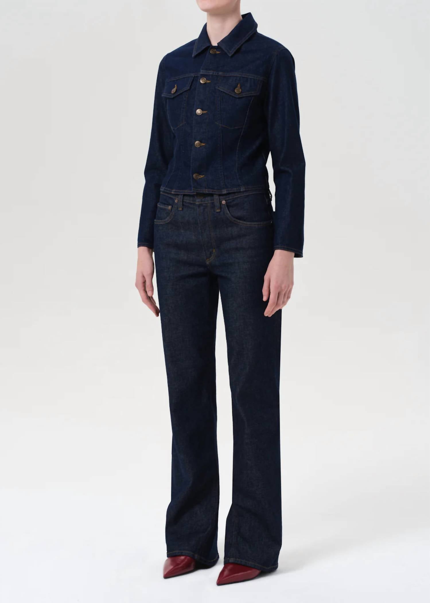 Introducing the AGOLDE Contoured Long Sleeve Jacket, a chic addition to any wardrobe with its flattering, fitted silhouette and shaping seams. Crafted from a sustainable blend of 80% regenerative cotton and 20% post-consumer recycled cotton, this casual jacket offers a polished look in a deep indigo rinse. It features a button closure for easy wear and is designed with convenience in mind with pockets included. Care instructions: Machine wash and tumble dry. Made for women, this imported piece effortlessly combines style and sustainability.