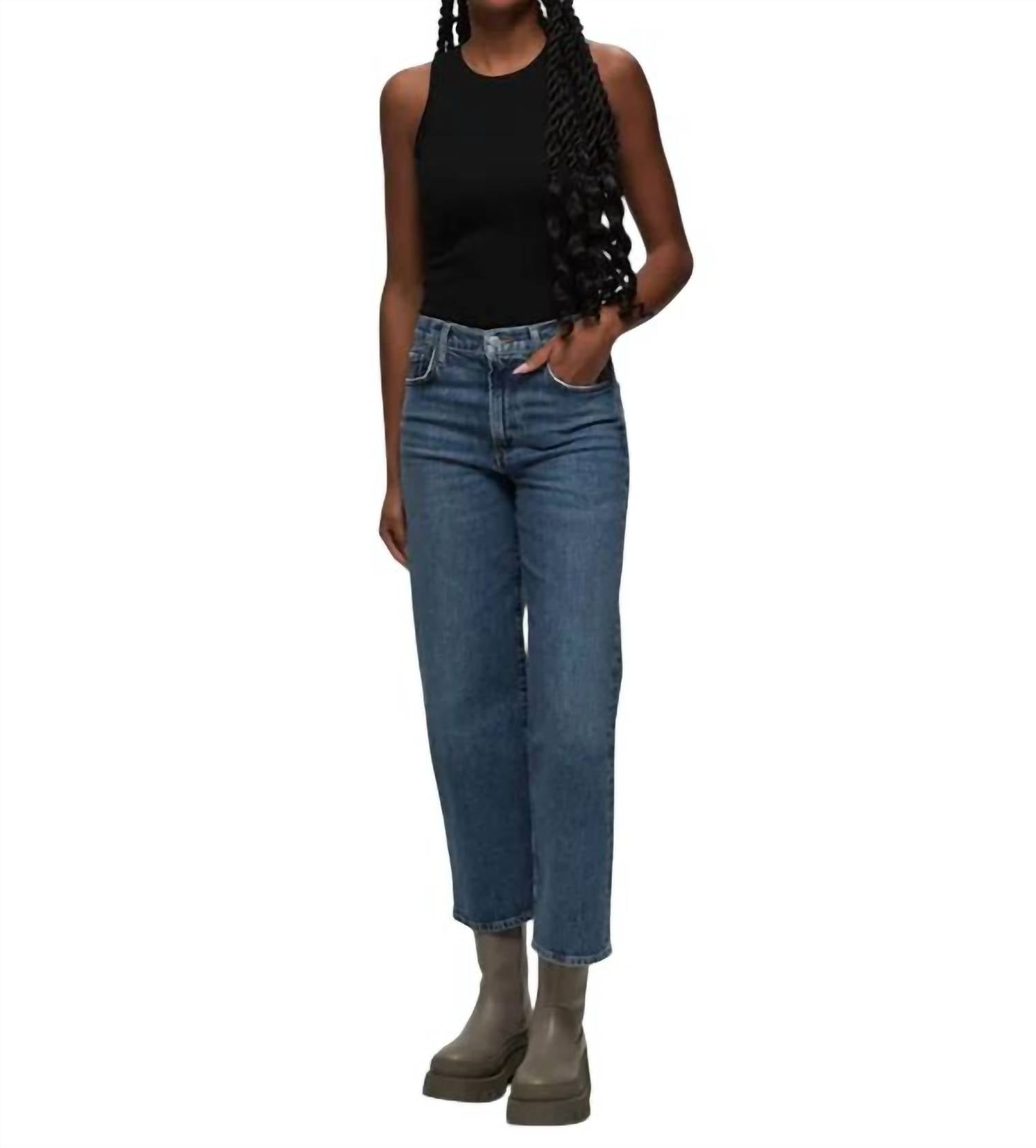 Calça jeans folgada de cintura média com um bloco superior quadrado que valoriza o corpo. Silhueta reta e discreta, com pernas largas. Cintura média. Tamanho real. Lavagem à máquina com água fria. 88% algodão, 1% algodão reciclado pós-consumo, 1% elastano.