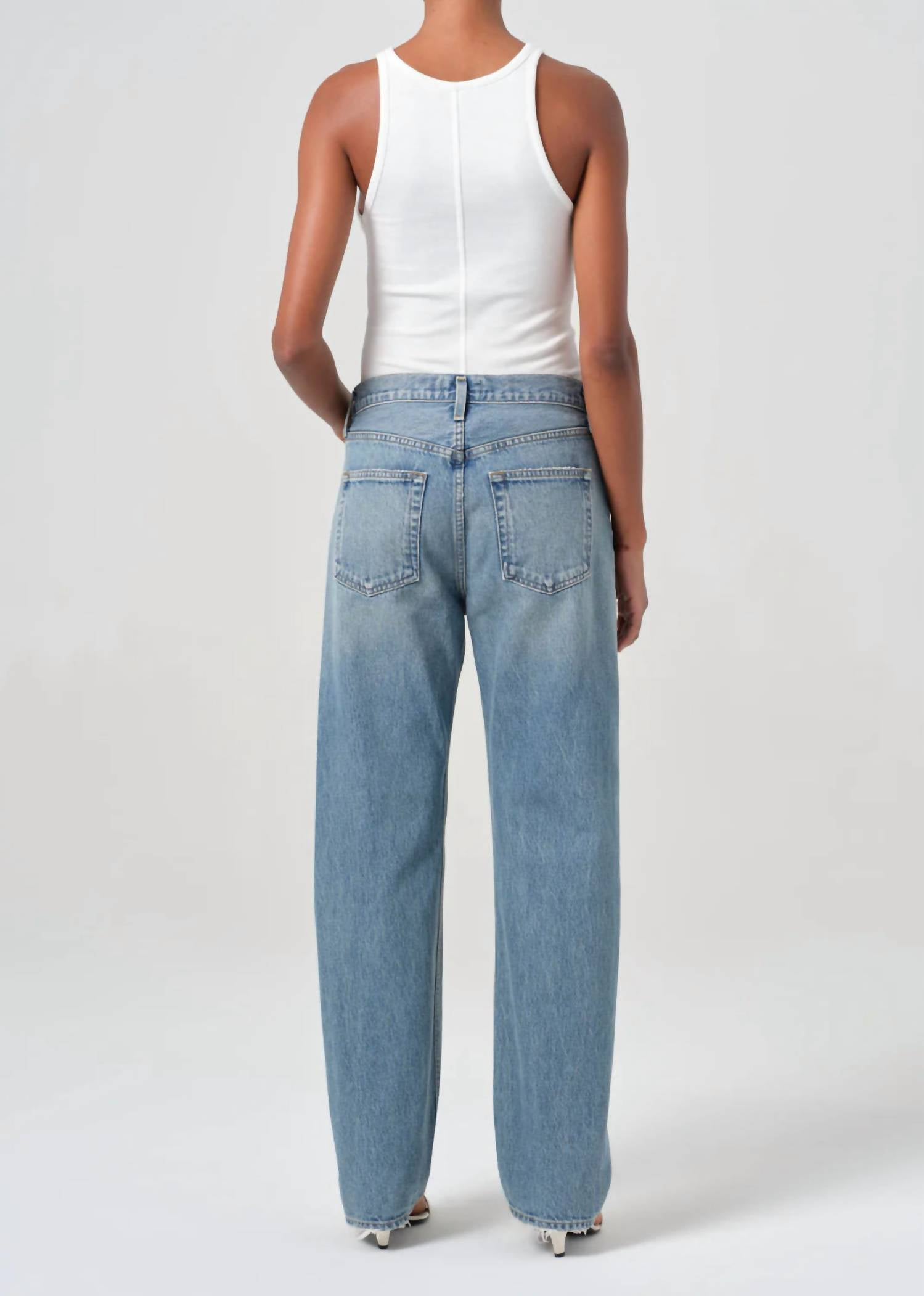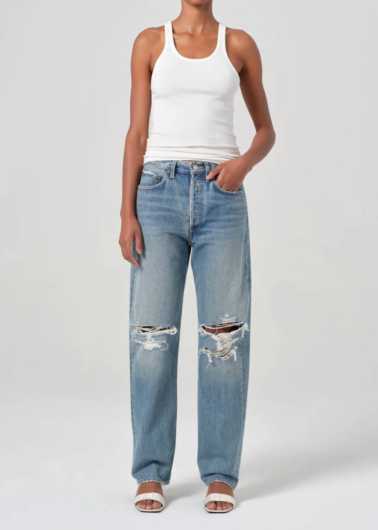 Combine esta calça jeans reta com sapatilhas, sandálias ou até mesmo saltos! Não tem como errar. Descubra a calça jeans Kelly Ripped Faded da AGOLDE, o modelo reto perfeito para qualquer guarda-roupa. Confeccionada em 100% algodão regenerativo, em um cativante tom índigo médio chamado Backdrop, esta calça promete conforto e sustentabilidade. Possui cintura alta, bloco superior solto e costura interna estendida com inspiração vintage, perfeita para um caimento clássico. Fechamento: Fecho de zíper. Cuidados: Lavar à máquina com água fria, do avesso, secar em temperatura baixa.