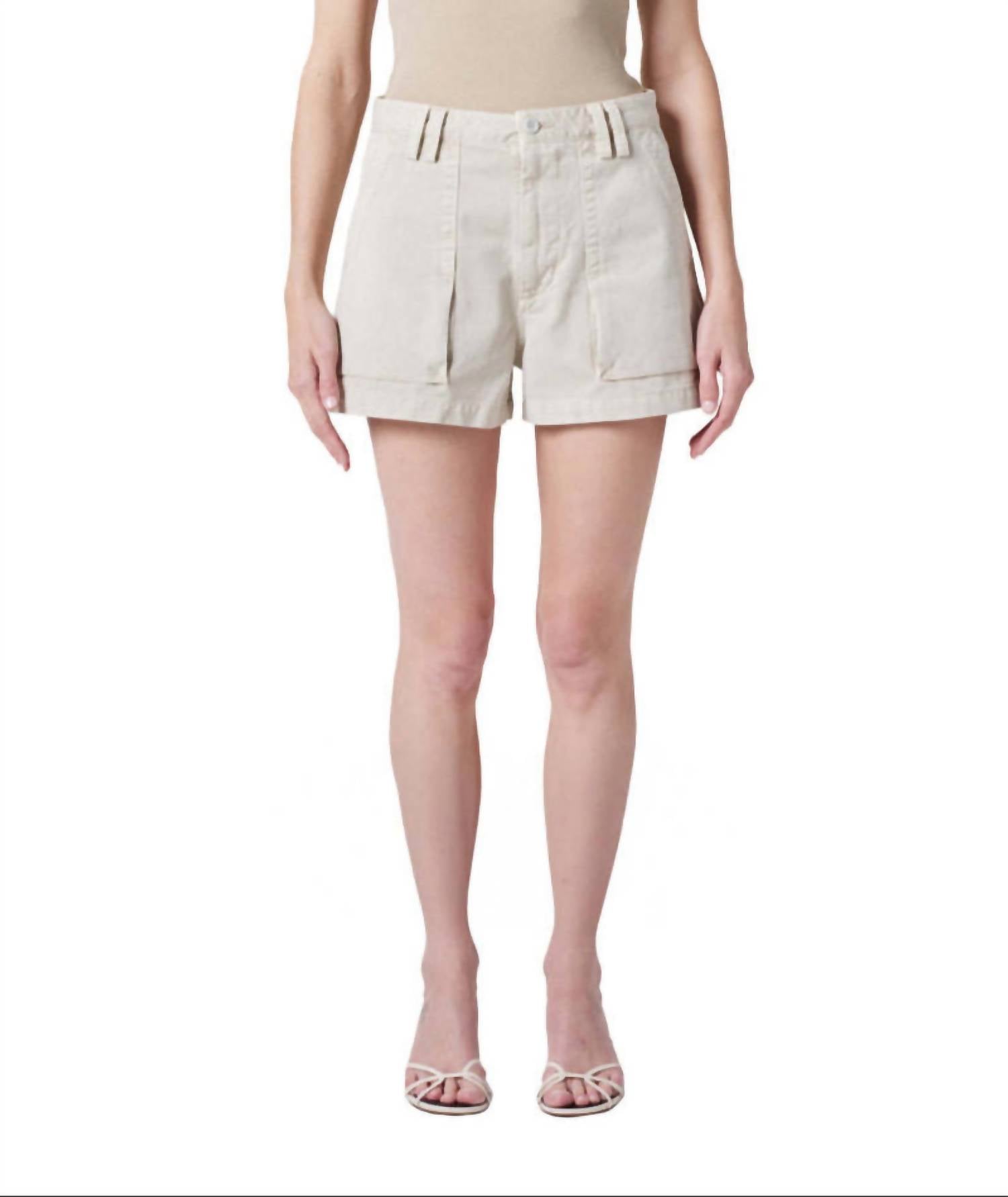 Meet the Kiva Cargo Shorts by AGOLDE, a perfect blend of utility and style in a washed-out green. Featuring a mid-rise fit and slight A-line silhouette, these shorts are crafted from 100% regenerative cotton twill with a button closure. The double belt loops and patch pockets add a vintage-inspired touch, while the midweight, non-stretch fabric maintains its shape throughout the day. Ideal for a minimalist summer vacation look, these solid high waist shorts are a true-to-size wardrobe staple.