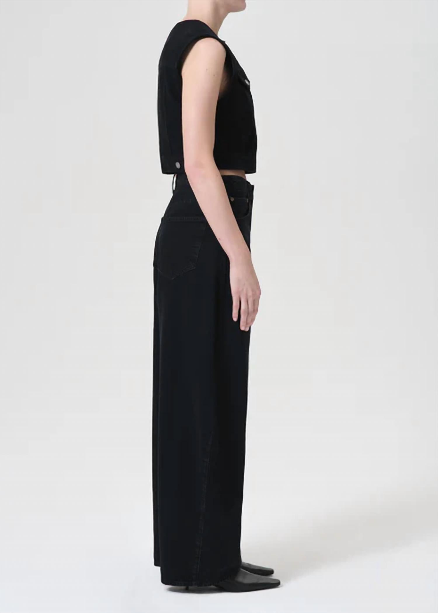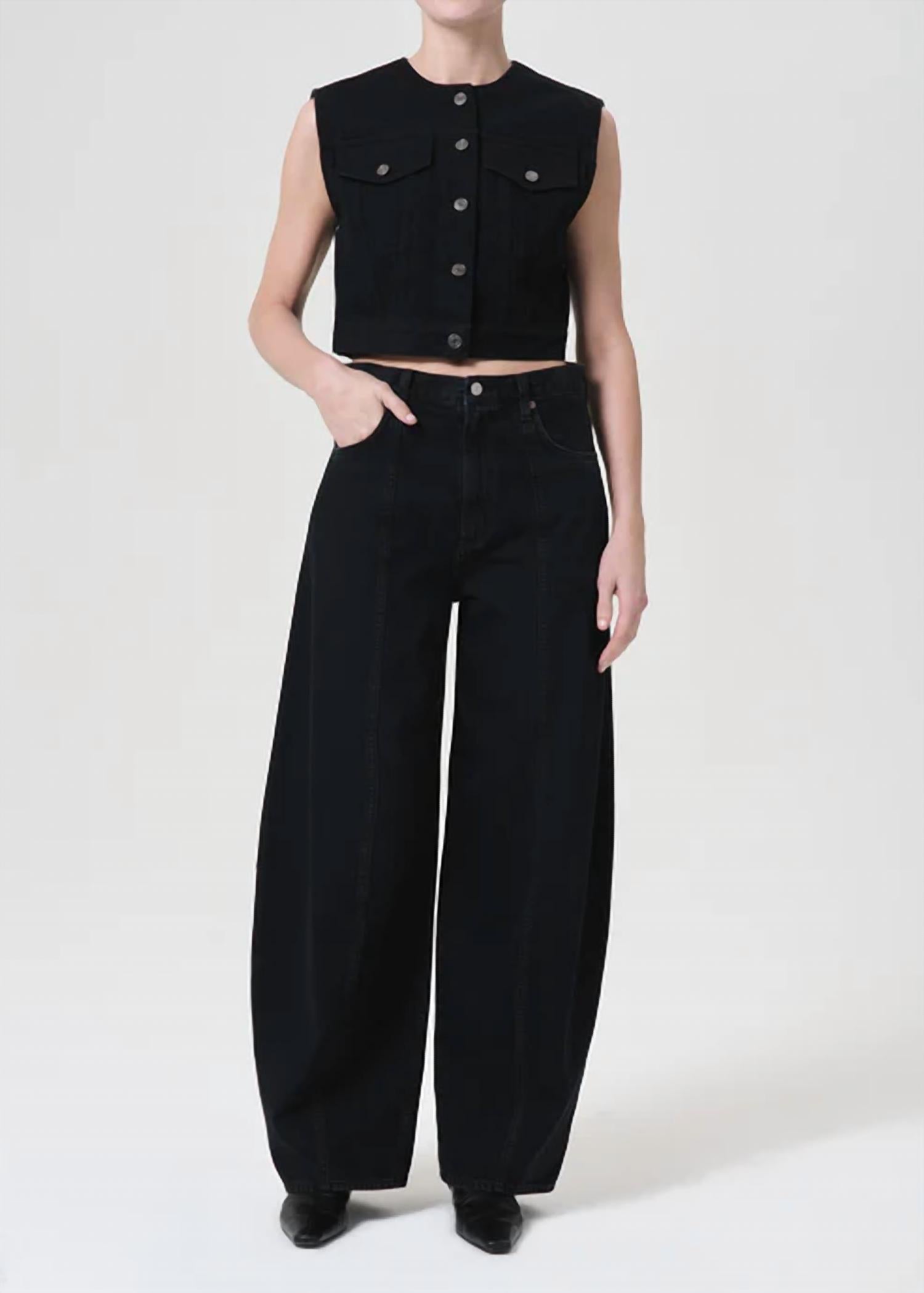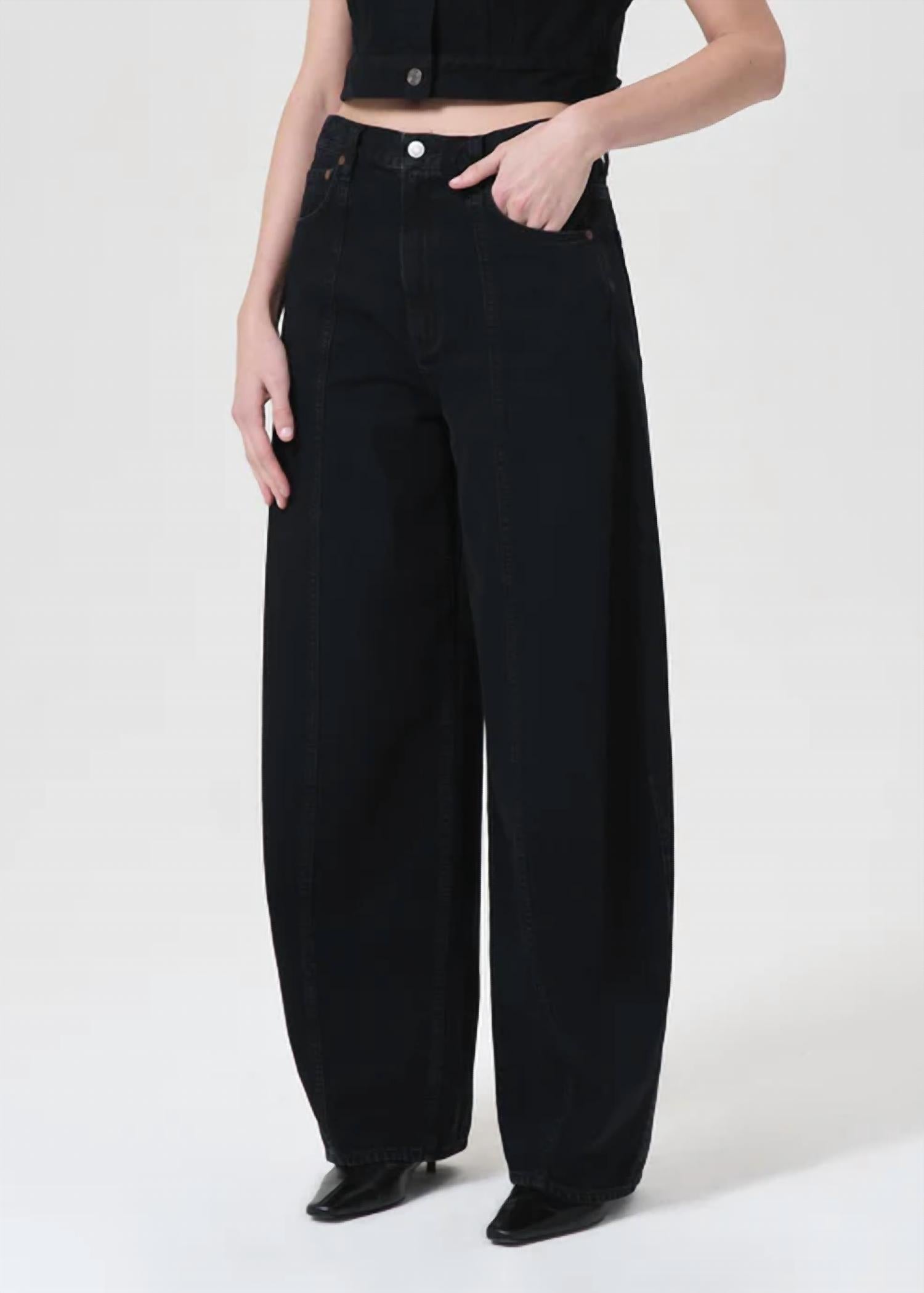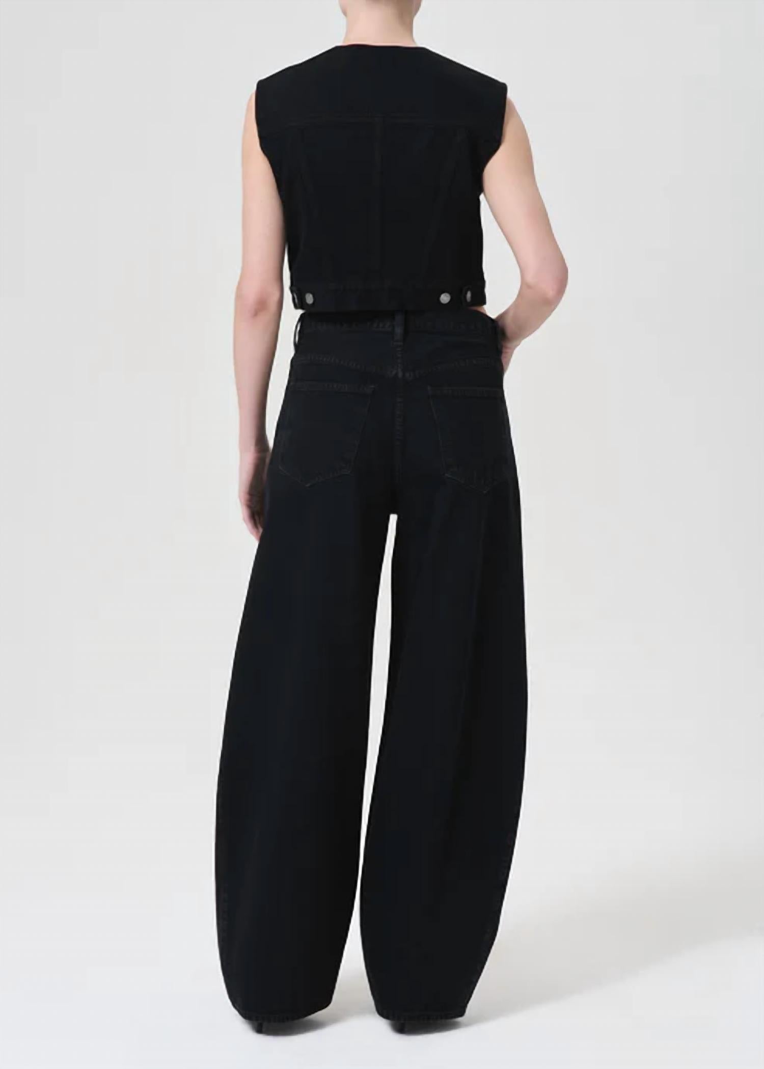 Uma silhueta elegante e surpreendentemente versátil. Apresentamos o Kristen Jean da AGOLDE, um clássico moderno criado para a tendência minimalista. Este jeans de perna larga apresenta um volumoso cós alto de 28 cm, acentuado por curvas marcantes e costuras centrais para uma silhueta elegante. Feito de 100% algodão regenerativo, oferece um acabamento preto intenso com efeito marmorizado e fica mais macio a cada uso. Fechamento: Braguilha com zíper. Cuidados: Lavar à máquina com água fria, do avesso, com cores semelhantes, secar em temperatura baixa. Fabricado nos EUA com materiais importados, este jeans promete estilo e conforto para o outono. A modelo tem 1,78 m e veste tamanho 27.
