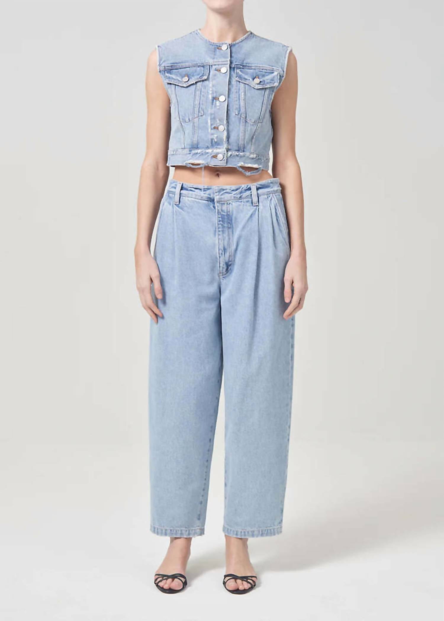 Apresentamos o Colete Cropped Leo da AGOLDE, um item essencial e chique para o seu guarda-roupa de verão. Este colete sem mangas é confeccionado em uma mistura de 80% algodão orgânico e 20% algodão reciclado, proporcionando um caimento fresco e confortável. Fabricado na Turquia, o colete apresenta uma cor sólida "Fray" com detalhes clássicos de jaqueta jeans e fecho de botão. Fácil de cuidar, com instruções de lavagem à máquina, esta peça é estilosa e sustentável.