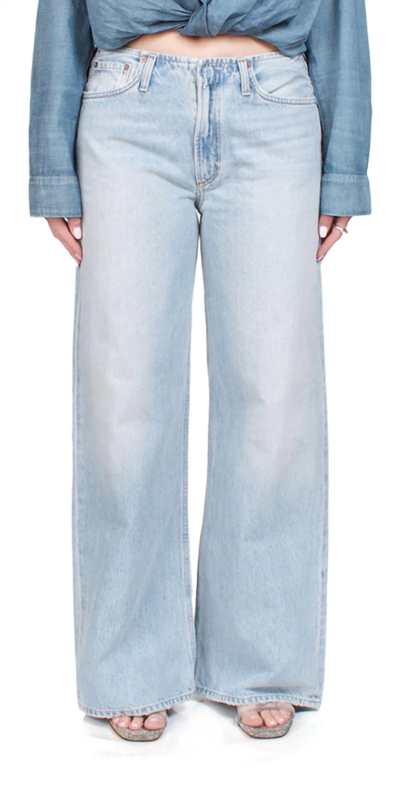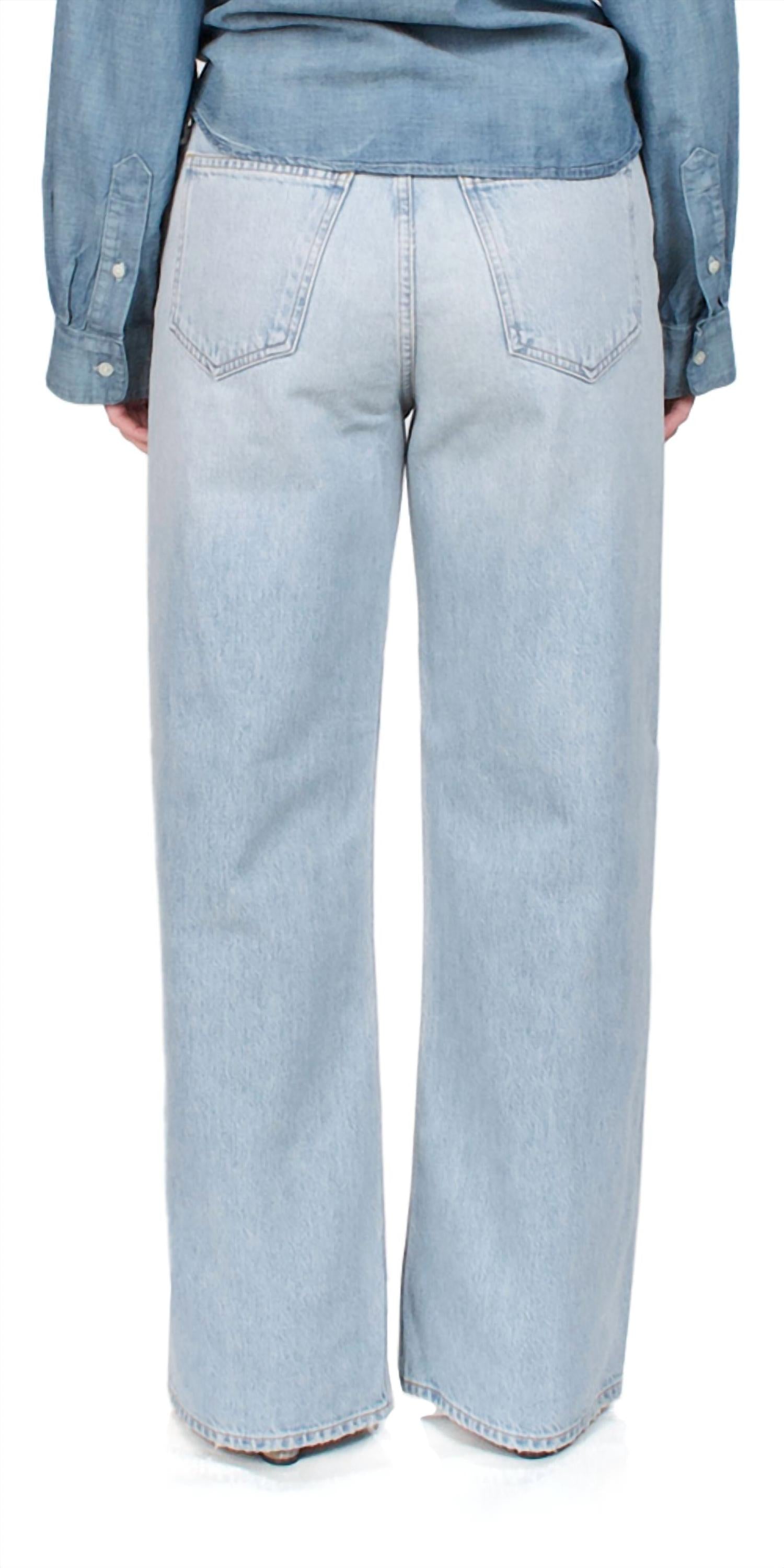 Introducing the Lex No Waistband Jeans by AGOLDE, a must-have for those who value both style and comfort. Featuring a low-rise fit and wide leg, these jeans are crafted from 100% regenerative cotton in a washed-out light indigo hue. Designed with a unique removed waistband detail, they offer a fresh take on AGOLDE's iconic Low Slung Baggy jeans. Closure: Zip closure. Model is 5ft 5in and is wearing a size 27.