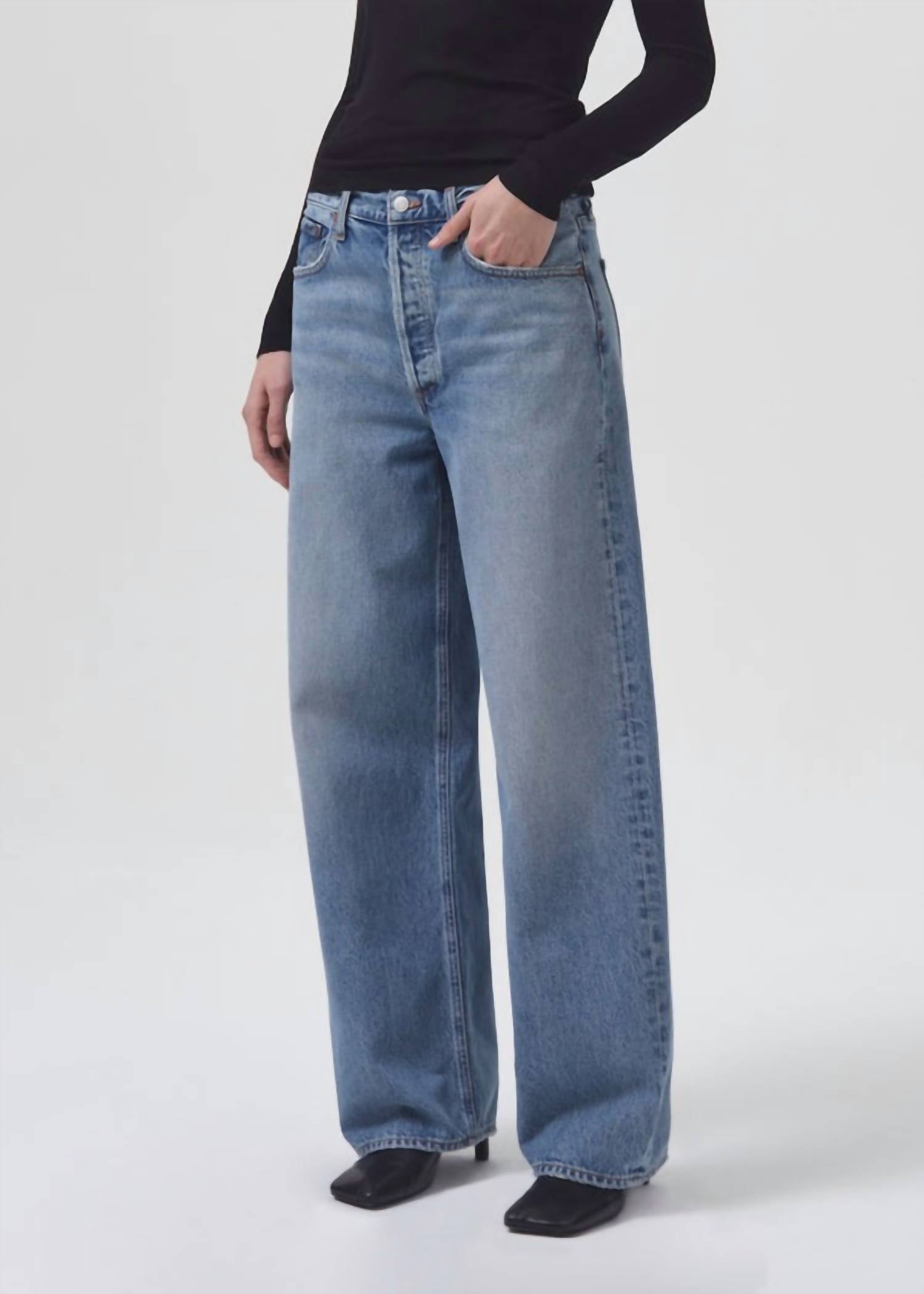 Combine esta calça jeans de perna larga com mules, slides ou suas sandálias de tiras favoritas. Apresentamos a Calça Jeans Baggy de Cintura Baixa da AGOLDE, confeccionada em 100% algodão orgânico, que proporciona um toque sem elasticidade e se torna mais macia com o uso. Esta calça jeans apresenta pernas largas e caimento relaxado, com cós alto de 30,25 cm e costura interna mais longa, de 77 cm, perfeita para uma silhueta ultra elegante e confortável. A cor índigo claro saturada, com desbotamento perceptível, complementa a estampa sólida, tornando esta calça uma escolha estilosa para a volta às aulas. O fecho de botão adiciona um toque clássico e é fácil de cuidar, com instruções de lavagem à máquina com água fria e secagem em temperatura baixa. A modelo tem 1,78 m e veste tamanho 27, com uma abertura de perna de 53 cm.