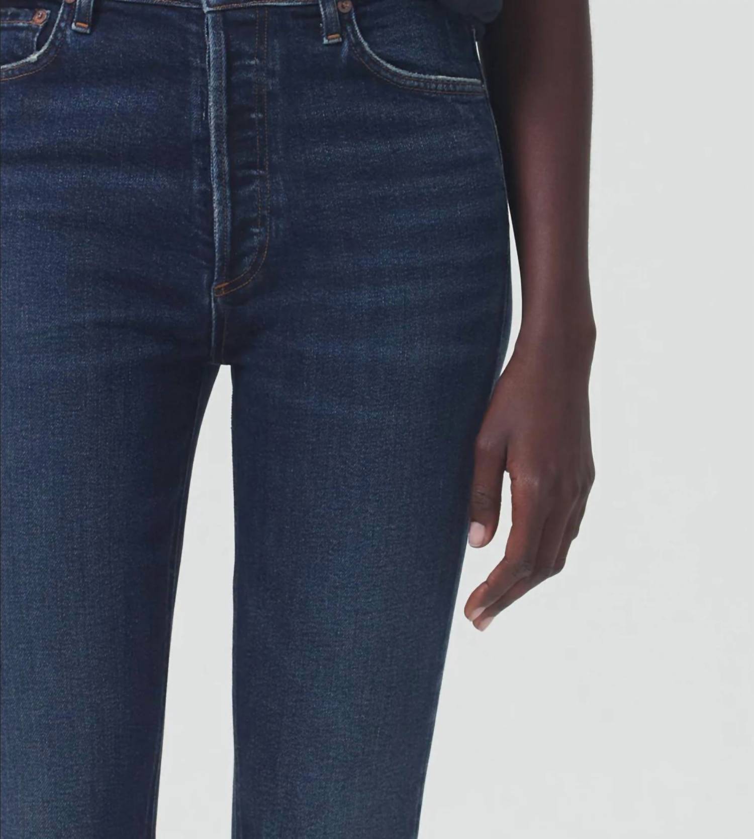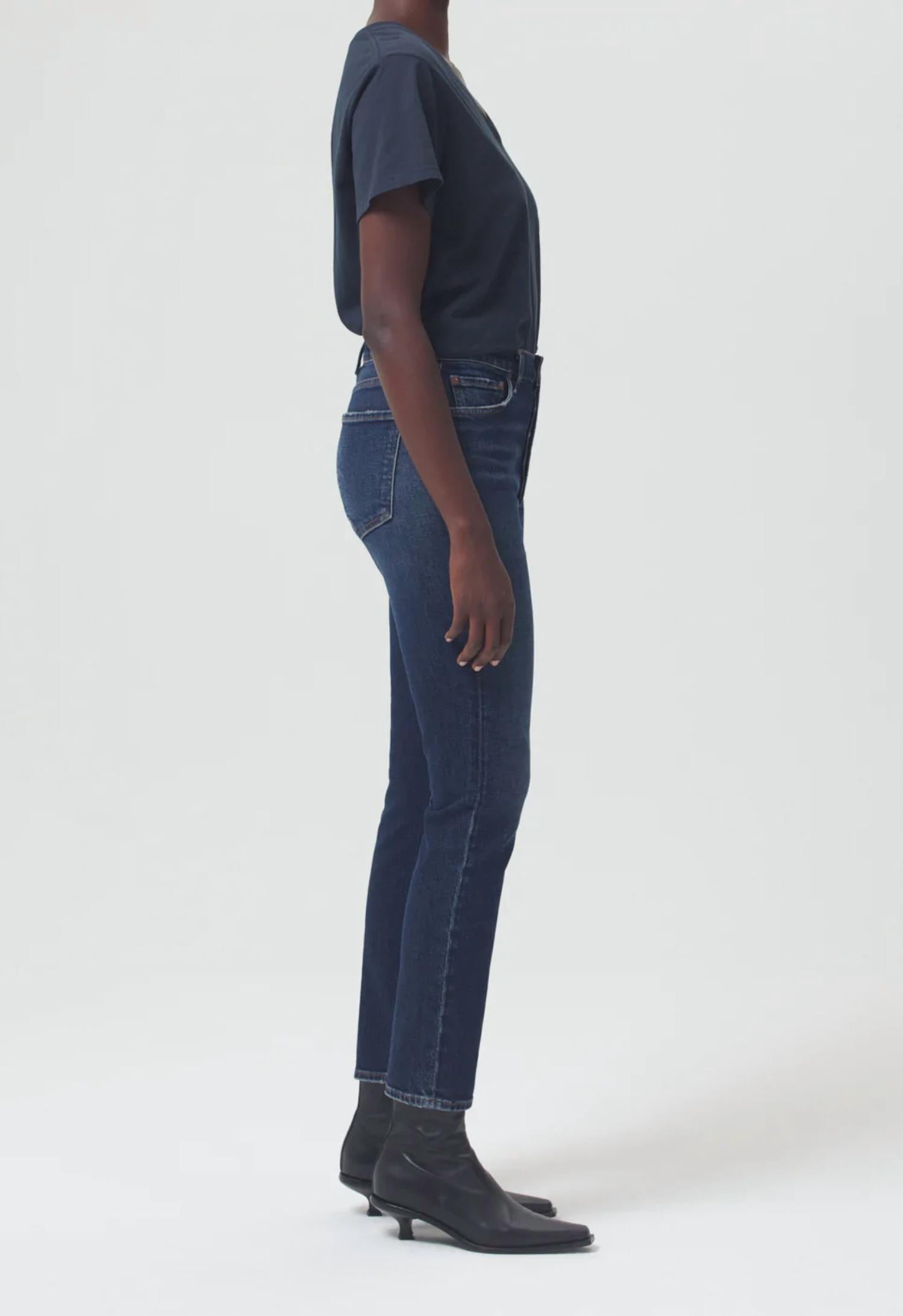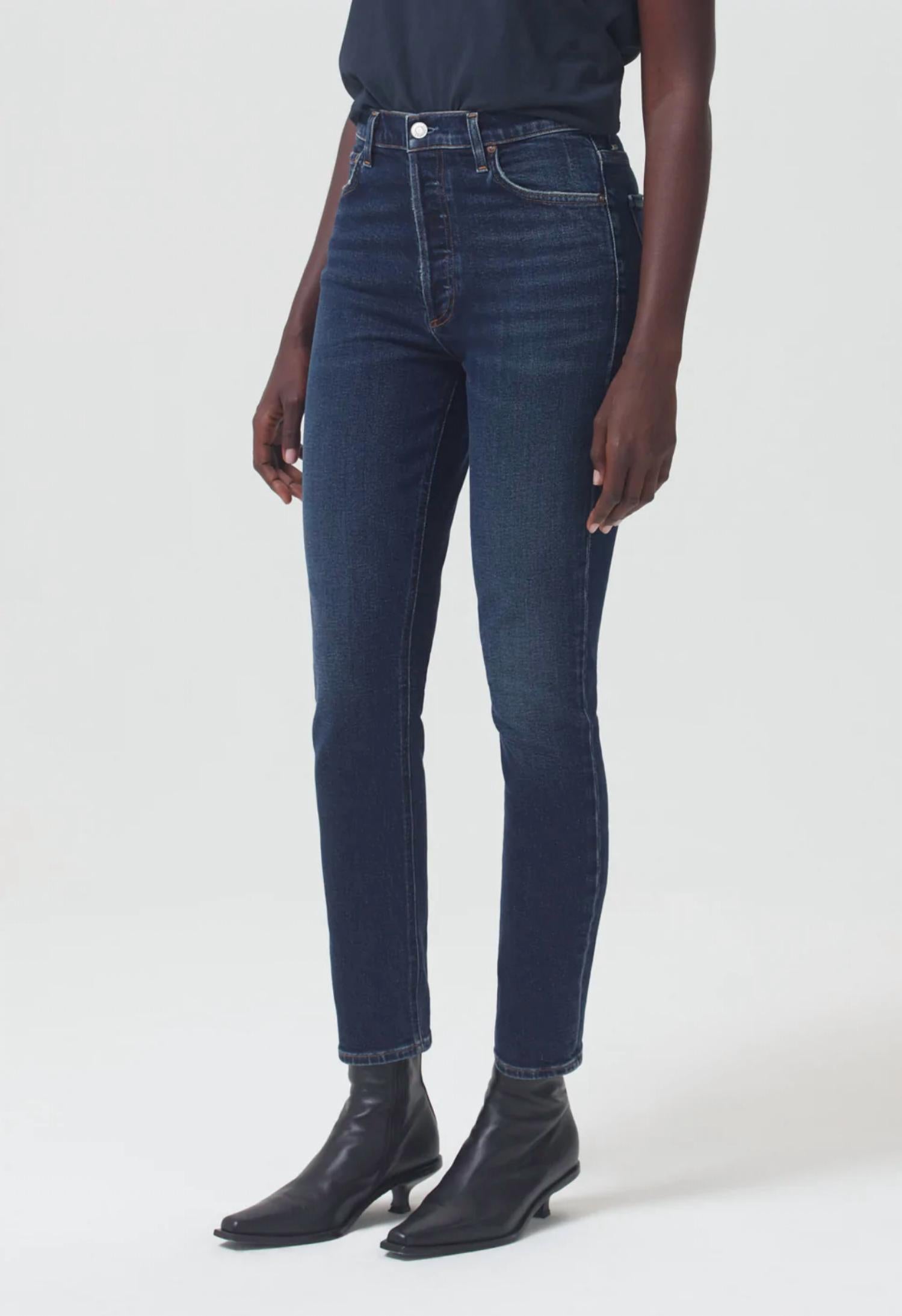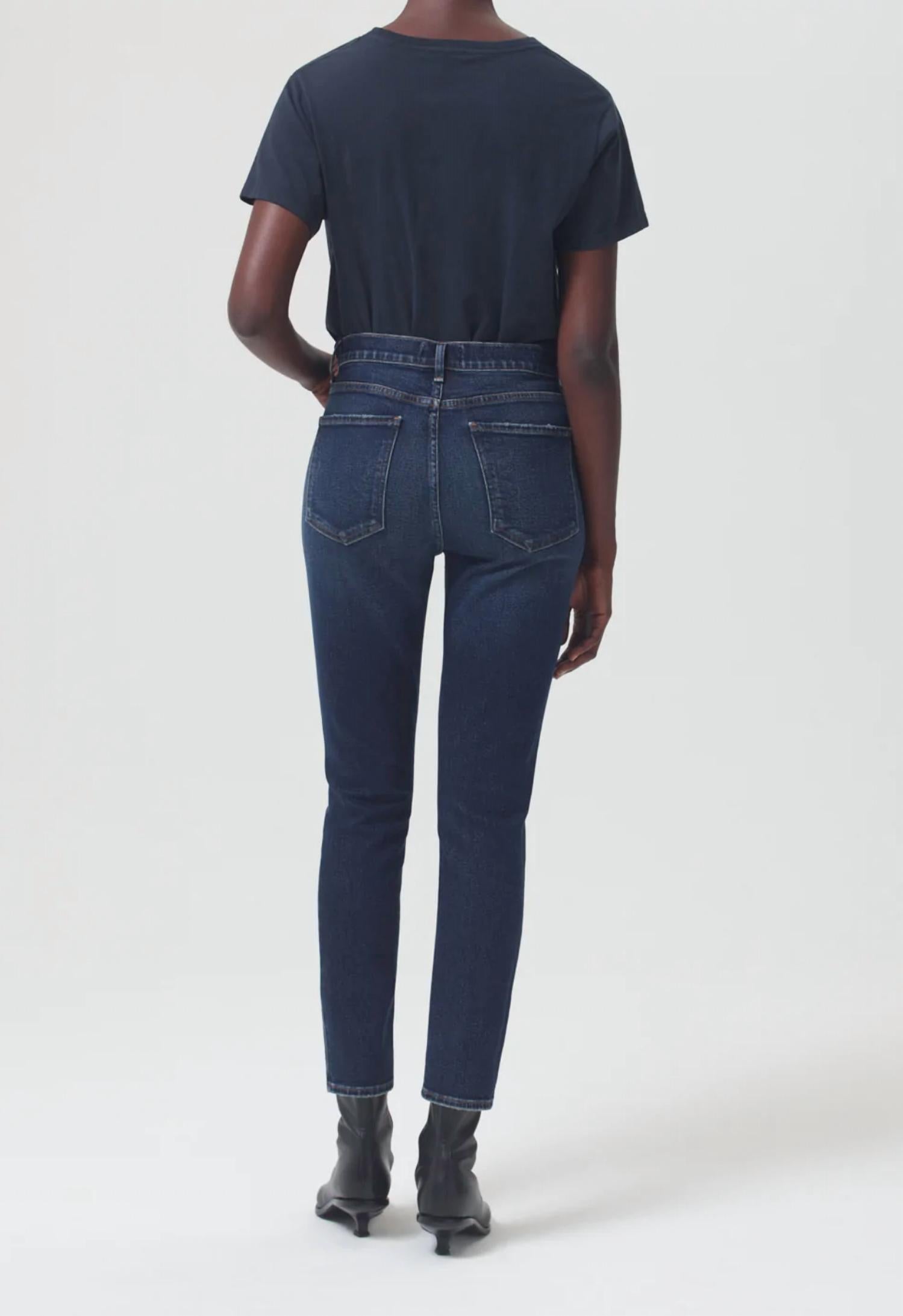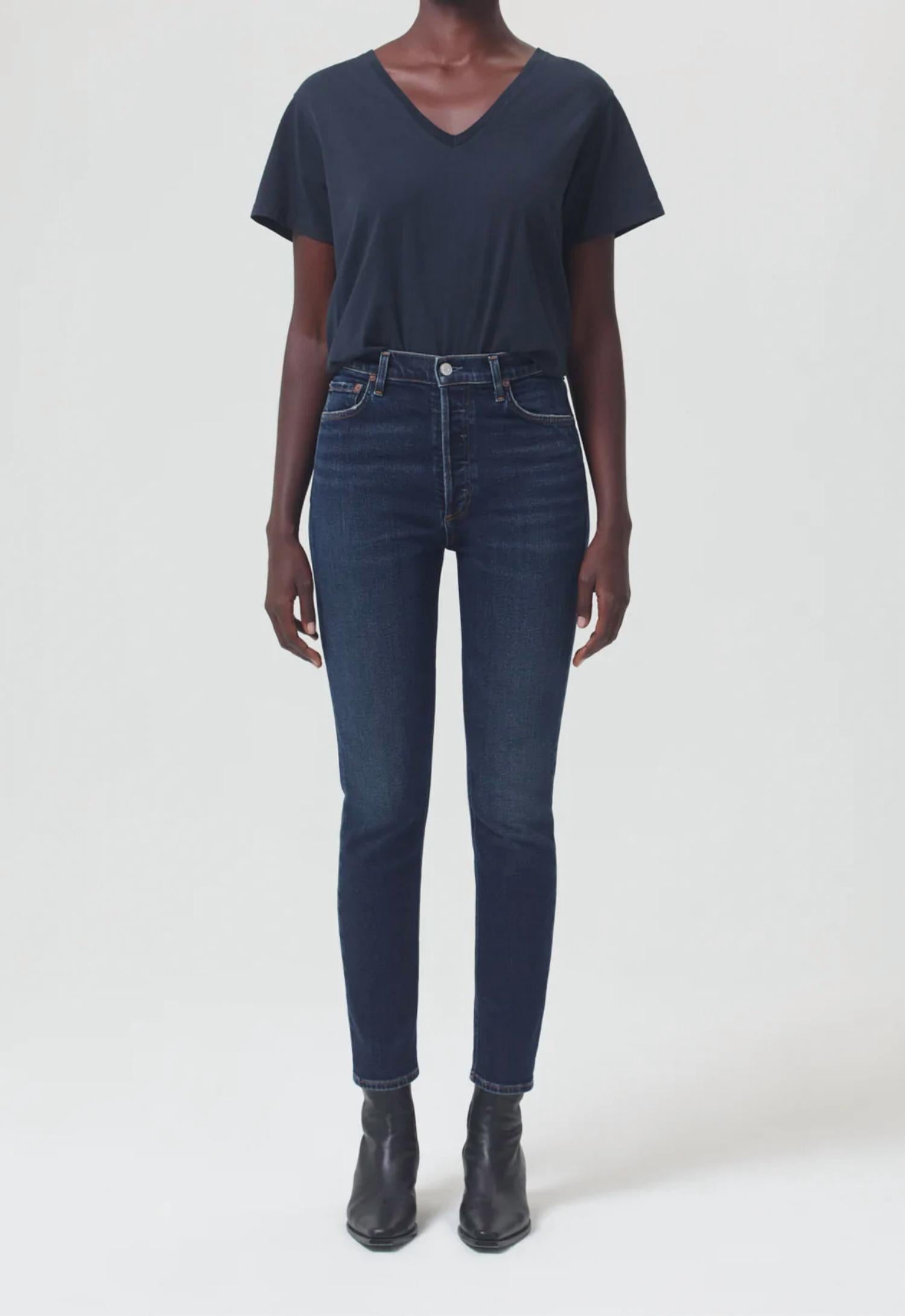 90% algodão, 6% algodão reciclado, 3% poliéster, 1% elastano. Apresenta cós alto ultraconfortável. Perna skinny elegante com comprimento até o tornozelo. O caimento é fiel ao tamanho. Índigo profundo com sutis ondulações e desbotamento, bainha acabada. Algodão reciclado supermacio com elasticidade e recuperação impecáveis.