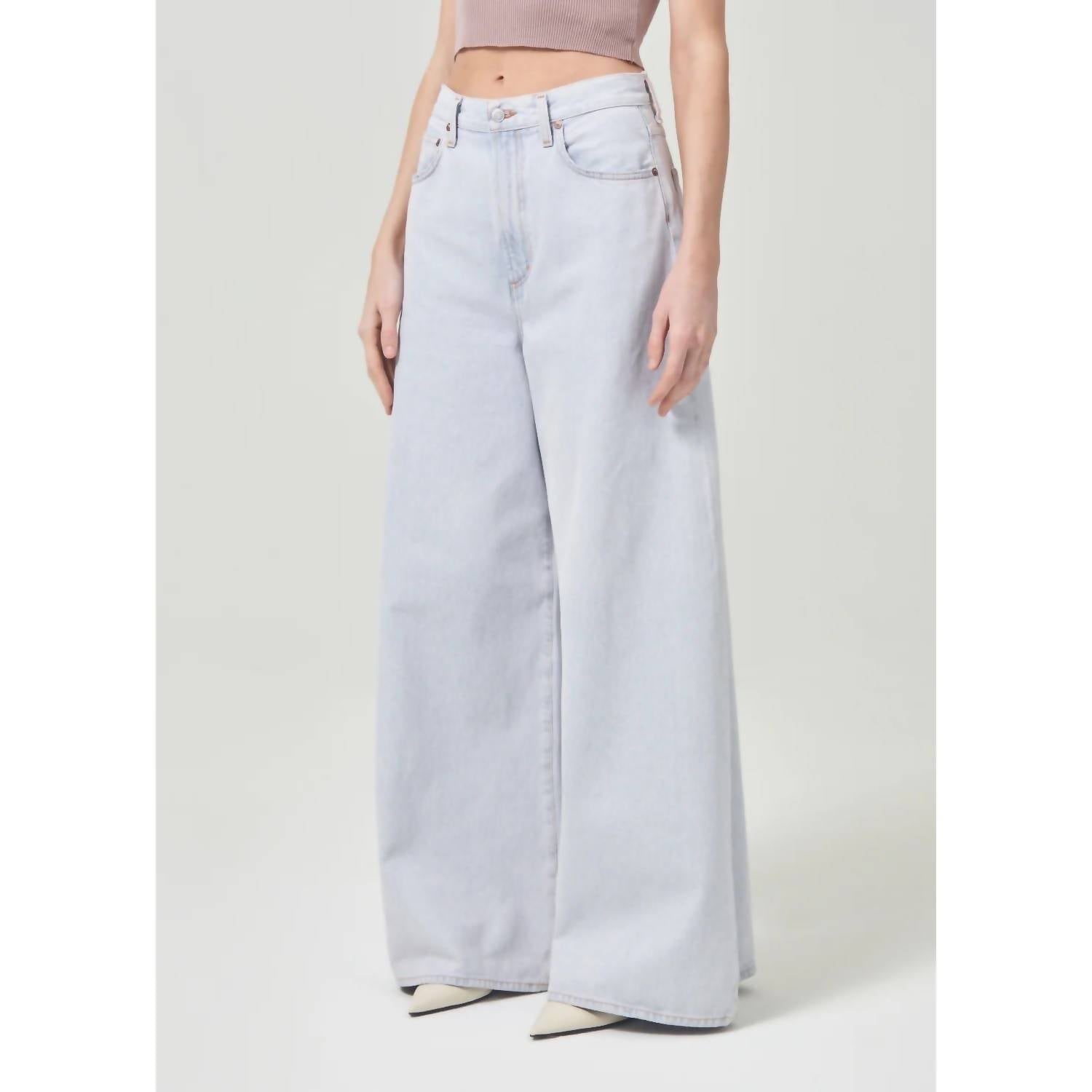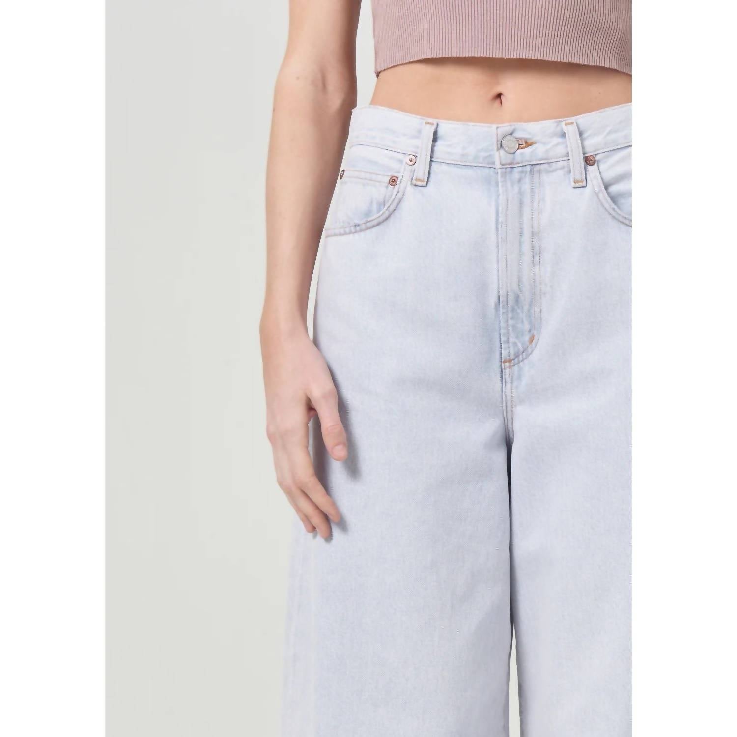 The Nolan Jean by AGOLDE is a statement piece in women's fashion, featuring a high-rise waist and a wide leg style with a gaucho silhouette, perfect for a holiday party. Crafted from zero stretch regenerative cotton, these jeans offer an ultra-soft feel in a solid balloon color with a light wash denim finish. The classic fit design includes utility-inspired pockets and a zip closure for practicality and style.