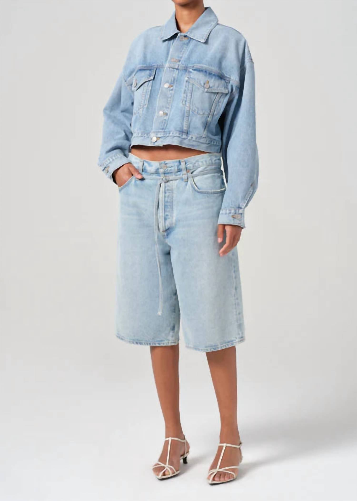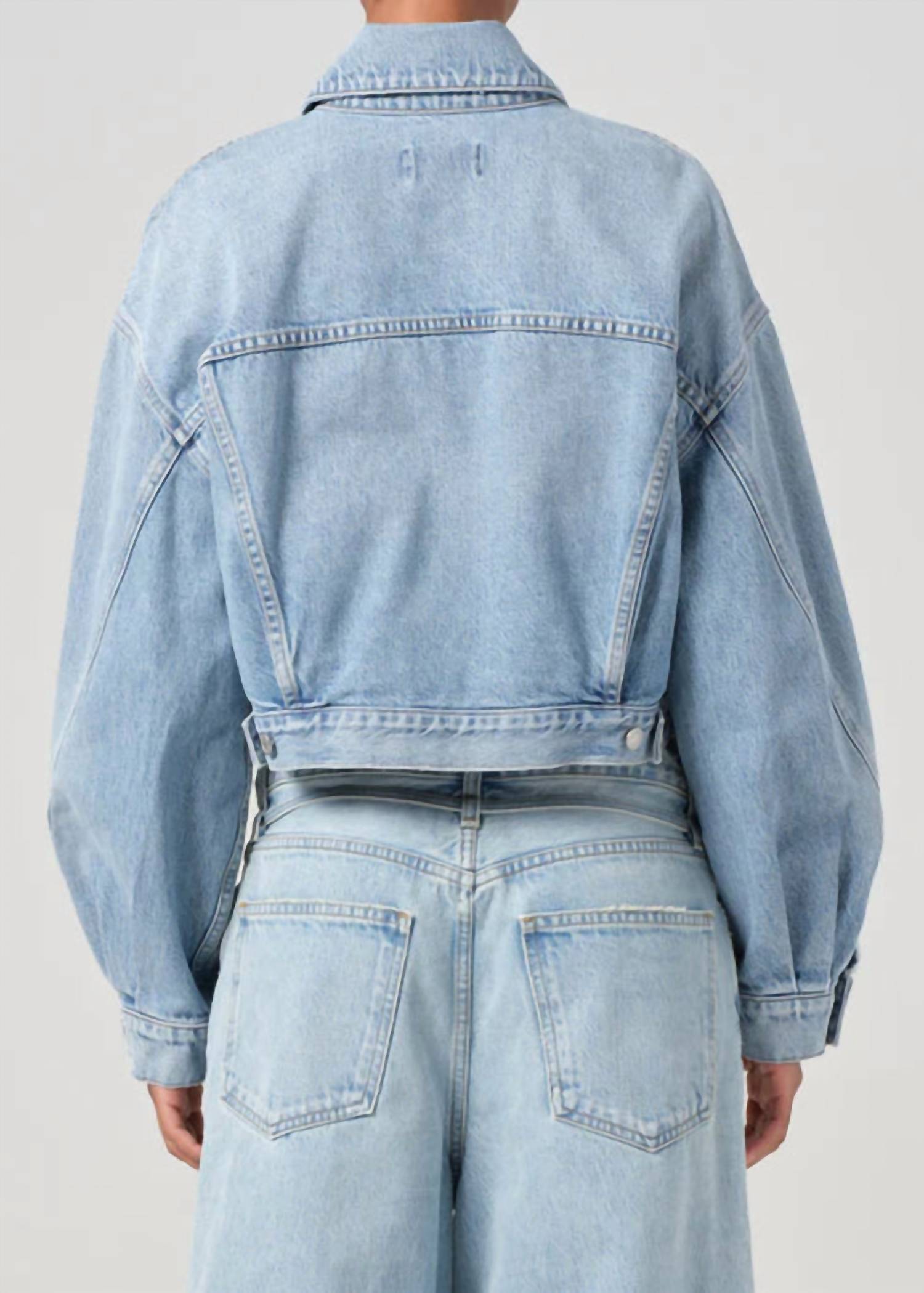 Descubra a Jaqueta AGOLDE Palmer no tom exclusivo "Space", que oferece uma versão atualizada de uma jaqueta jeans clássica. Esta peça apresenta mangas longas, baixas e exageradas, com formato balão, e um corpo cropped discreto, medindo 52 cm de comprimento. Confeccionada em 100% algodão regenerativo, a jaqueta é tão ecológica quanto estilosa. Fechamento por botão. Lavar à máquina com água fria, do avesso, em cores semelhantes; secar em temperatura baixa. A modelo tem 1,78 m e veste tamanho P.