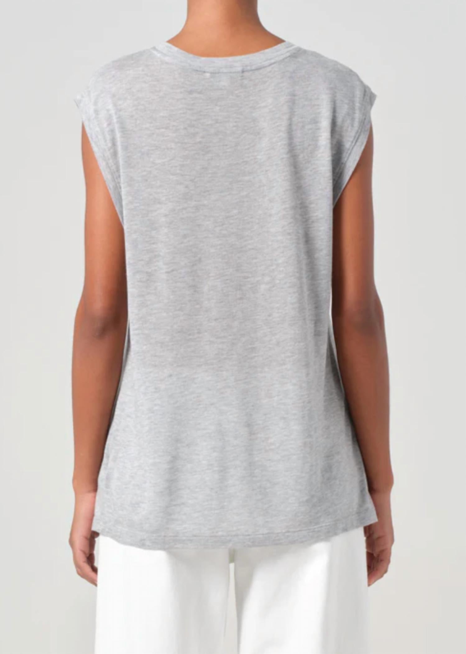 Introducing the Raya Muscle Tee by AGOLDE, a minimalist addition to your wardrobe in a classic grey heather. This sleeveless tee features a high crewneck and is crafted from 100% Lyocell, offering a soft, breathable touch. With its relaxed body and subtle cap sleeve, it's perfect for tucking into high-waist denim. Closure: Pull on. Care: Machine wash. Perfect for a spring engagement or Easter gathering.