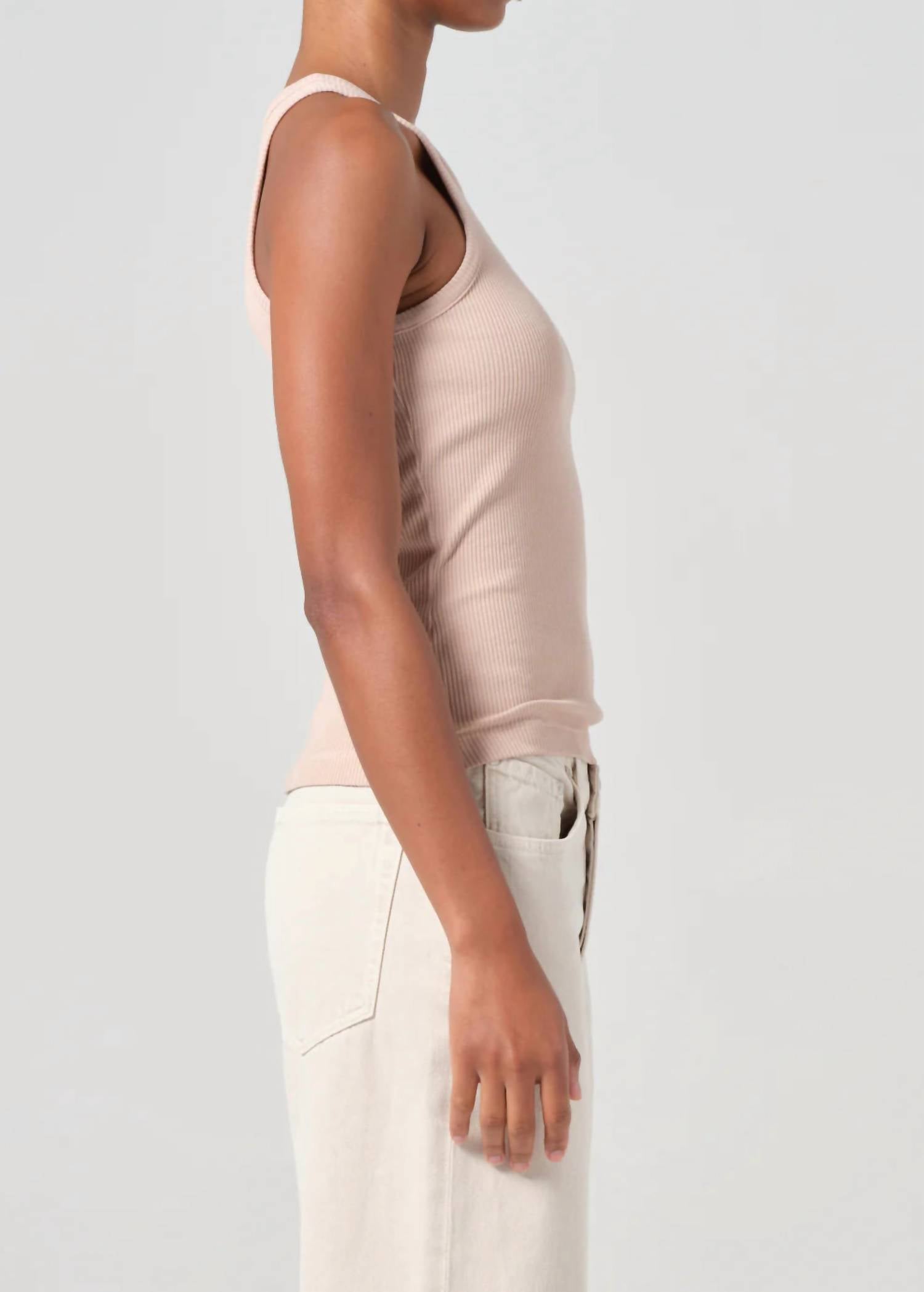 Caimento, tecido e funcionalidade. Esta regata preenche todos os requisitos. A Regata Sem Mangas Rayne da AGOLDE apresenta um estilo minimalista e chique, perfeito para as férias de primavera ou a Páscoa. Confeccionada em 49% algodão orgânico, 49% liocel e 2% elastano, esta regata apresenta gola alta esportiva e caimento justo, graças ao material canelado exclusivo da marca. Com um fecho prático, esta peça é feita sob medida para mulheres que apreciam elegância sem esforço. Os cuidados com esta regata em tom pó são simples: lavar na máquina e secar no varal.