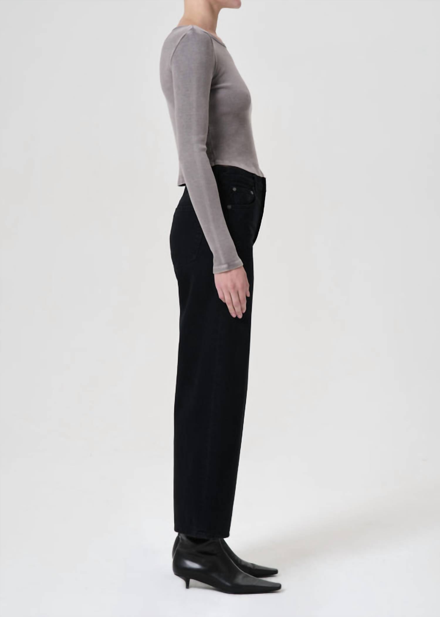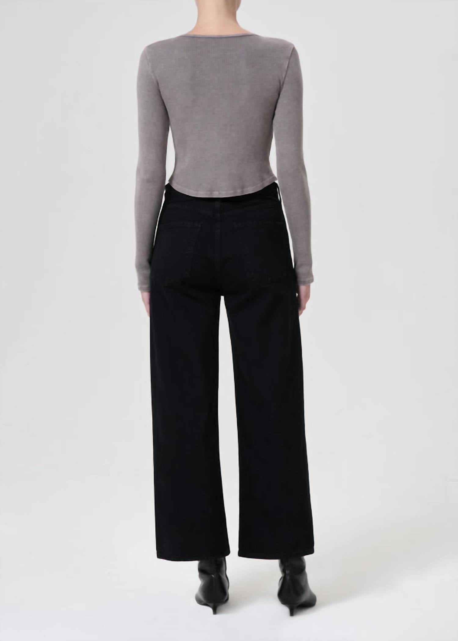 Coloque sua camiseta favorita dentro deste jeans de cintura alta para uma sensação mais casual e descolada. Apresentamos a calça jeans AGOLDE Ren High Rise em um tom Scowl marcante, habilmente confeccionada para uma mistura de estilo e conforto. Esta calça jeans feminina apresenta cintura alta e pernas largas, proporcionando um ajuste relaxado nos quadris. Confeccionada em 100% algodão, possui fecho de botão, cós de 31 cm, entrepernas de 71 cm e abertura de 49 cm. Orgulhosamente fabricada na Turquia com materiais importados, esta calça jeans é fácil de cuidar: lave na máquina com água fria, do avesso, em cores semelhantes, e seque em temperatura baixa. A modelo tem 1,78 m e veste tamanho 27.