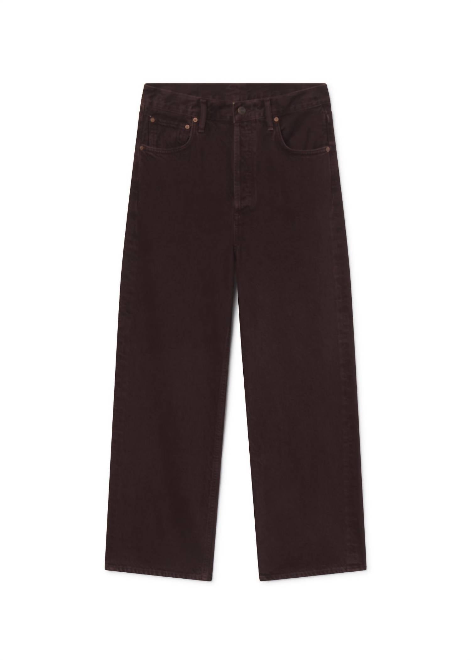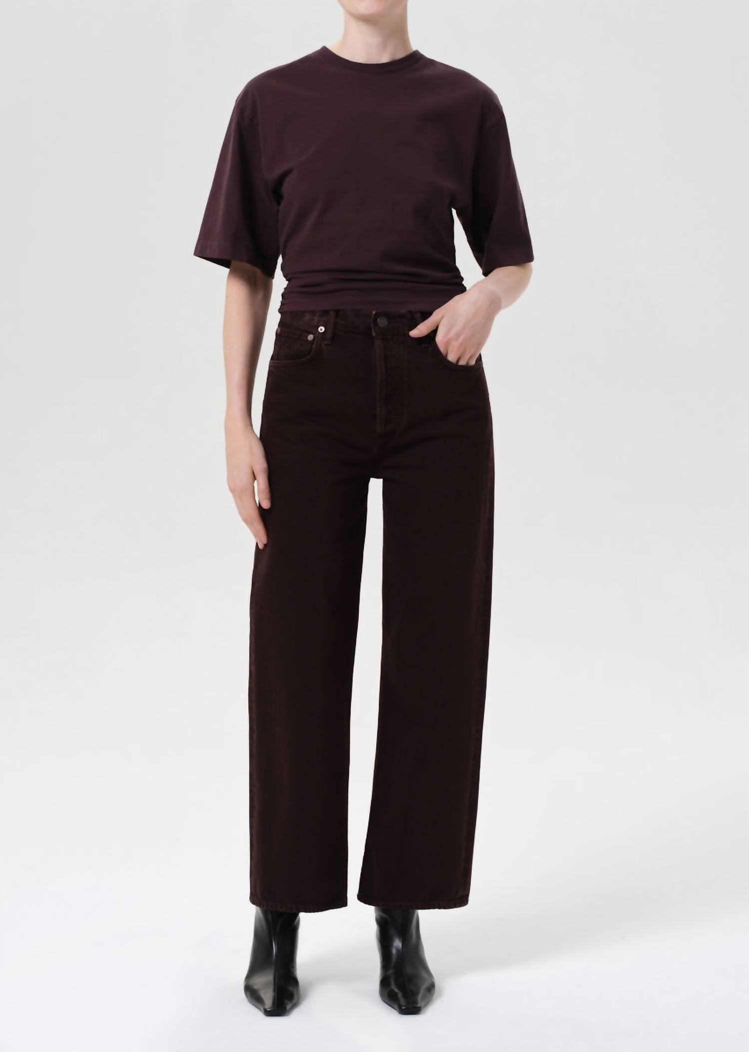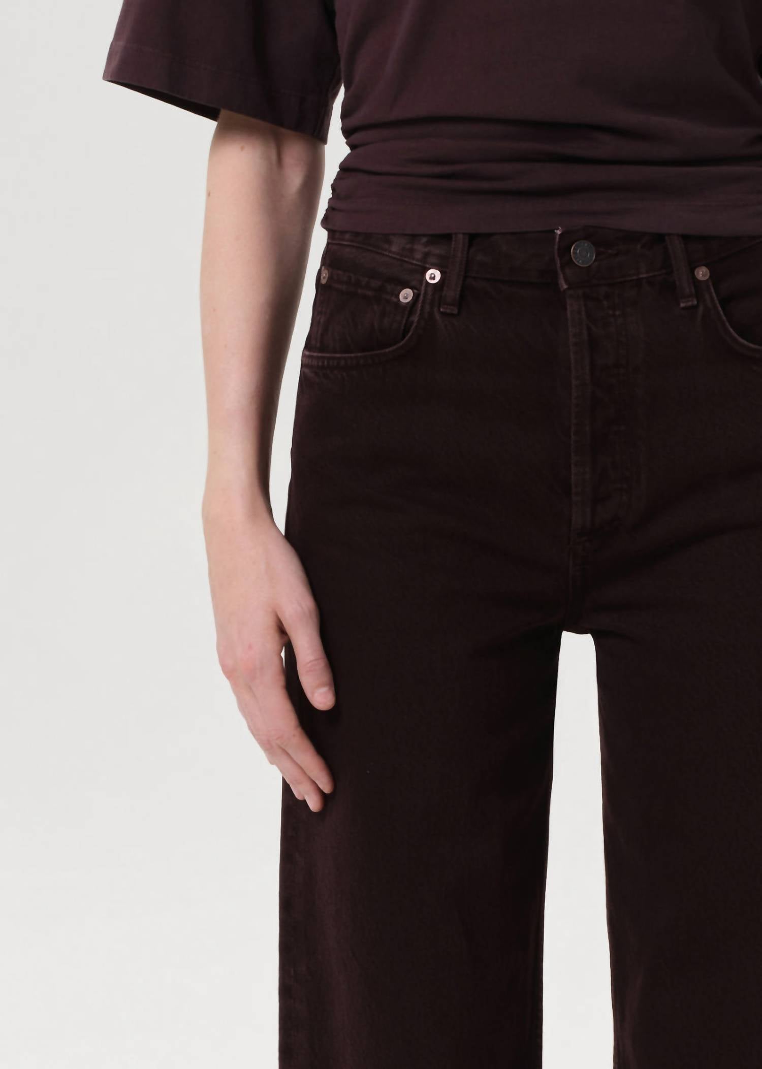 Introducing the Ren High Rise Wide Leg Jeans by AGOLDE, a modern twist on a classic silhouette crafted for streetwear chic. These jeans feature a high-rise and relaxed fit with wide cropped legs, made from 100% rigid, non-stretch regenerative cotton in the rich Sloe Berry hue. With a solid pattern, button closure, and practical pockets, they promise both style and function. Originating from AGOLDE’s commitment to quality, they are perfect for fall concert outings.