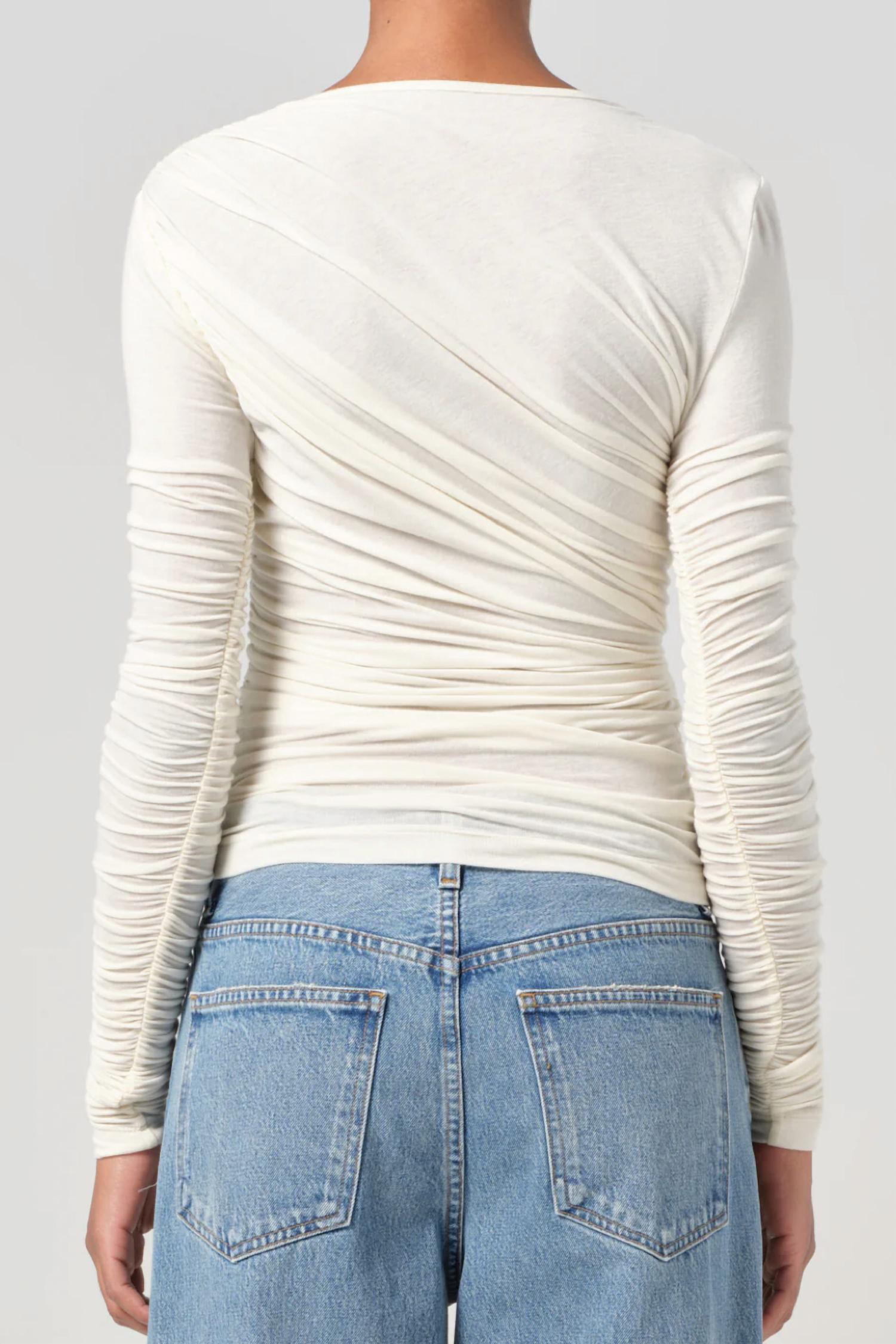 The perfect long sleeve tee that goes with just about anything. Elevate your wardrobe with the AGOLDE Tania Twist Tee, a minimalist piece ideal for any vacation-ready closet. Crafted in the USA with long sleeves, this tee is made from a blend of 94% Tencel and 6% Spandex, offering a luxurious ultra-fine soft-stretch fabric in a captivating oatmilk hue. Featuring a slim fit with layered diagonal ruching, it has a slightly-sheer finish perfect for that chic yet understated look. This crewneck tee is easy to care for with its machine wash cold and tumble dry low instructions, making it as practical as it is stylish. Garment Length: 19.5 inches.