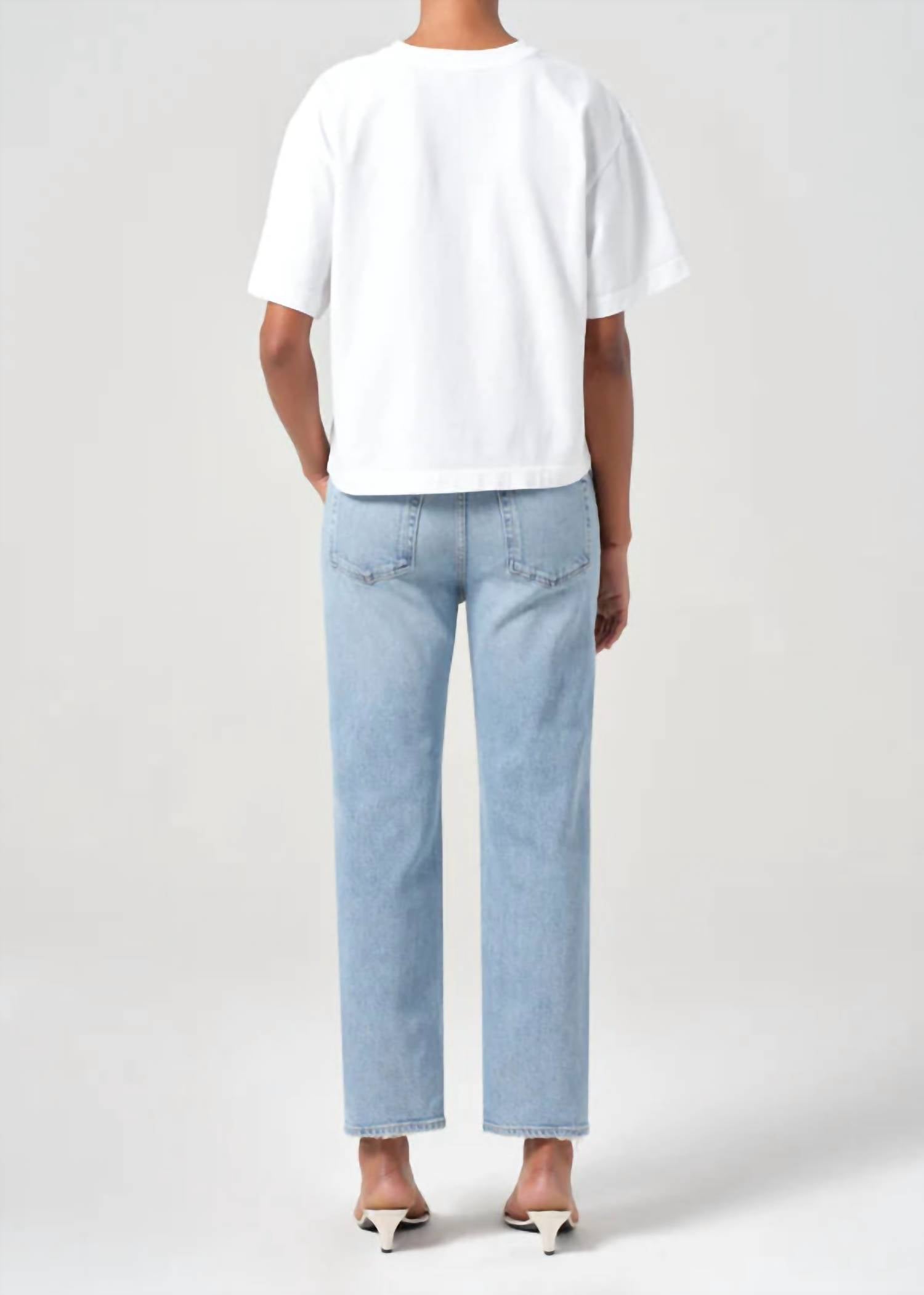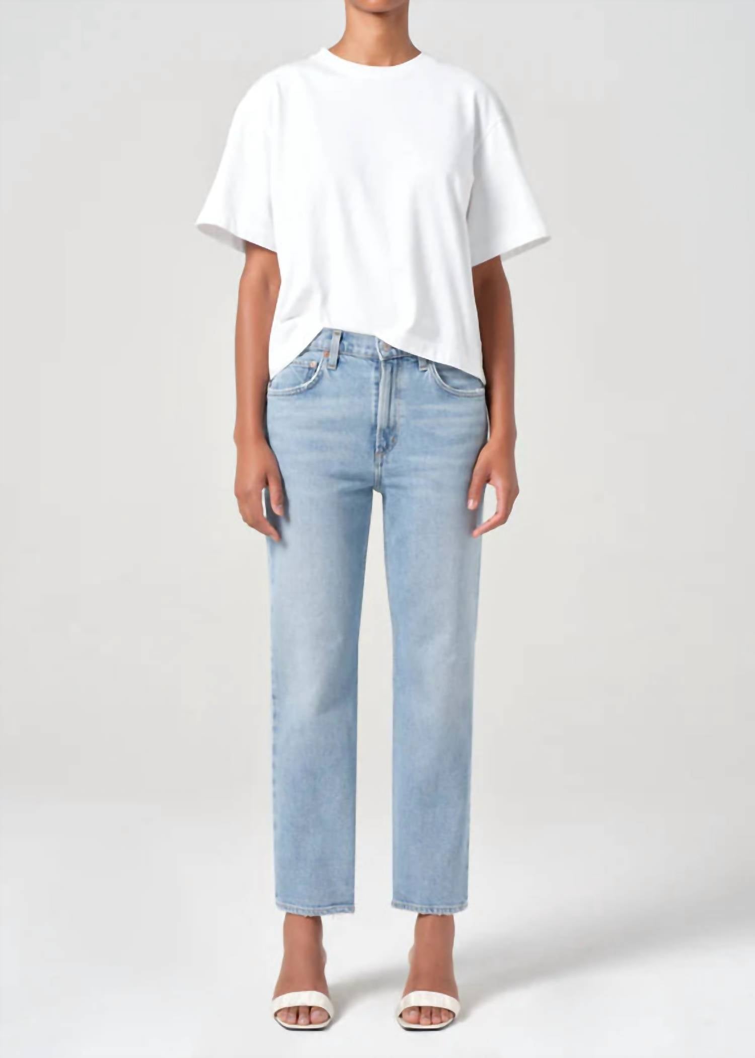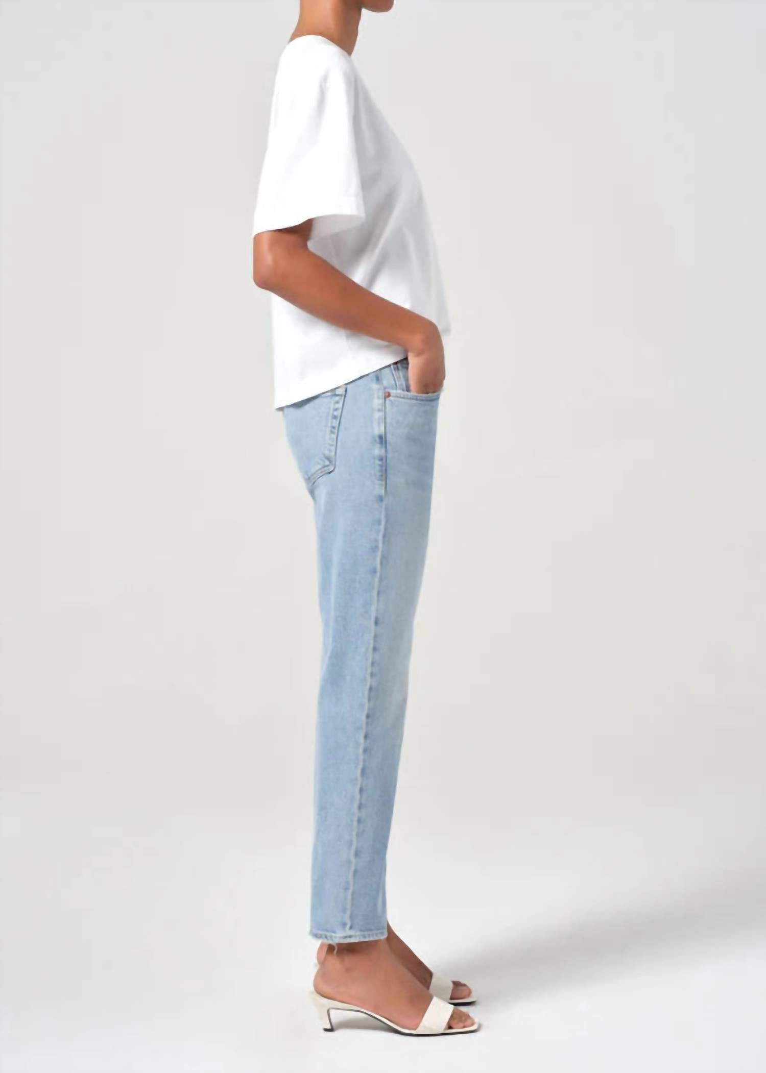 Apresentamos o Valen Jean da AGOLDE, uma mistura perfeita de estilo e conforto com sua cintura média e corte reto. Este jeans é confeccionado em 99% algodão regenerativo e 1% elastano, proporcionando toque macio e elasticidade confortável. Com um cós de 28 cm e costura interna de 72 cm, este jeans tem acabamento em tom "Fórmula" com lavagem clara, com vincos e desbotamento para um toque vintage. Fechamento: Braguilha com zíper. Cuidados: Lavar à máquina com água fria, do avesso, com cores semelhantes, não usar alvejante e secar em temperatura baixa. A modelo tem 1,78 m e veste tamanho 27.