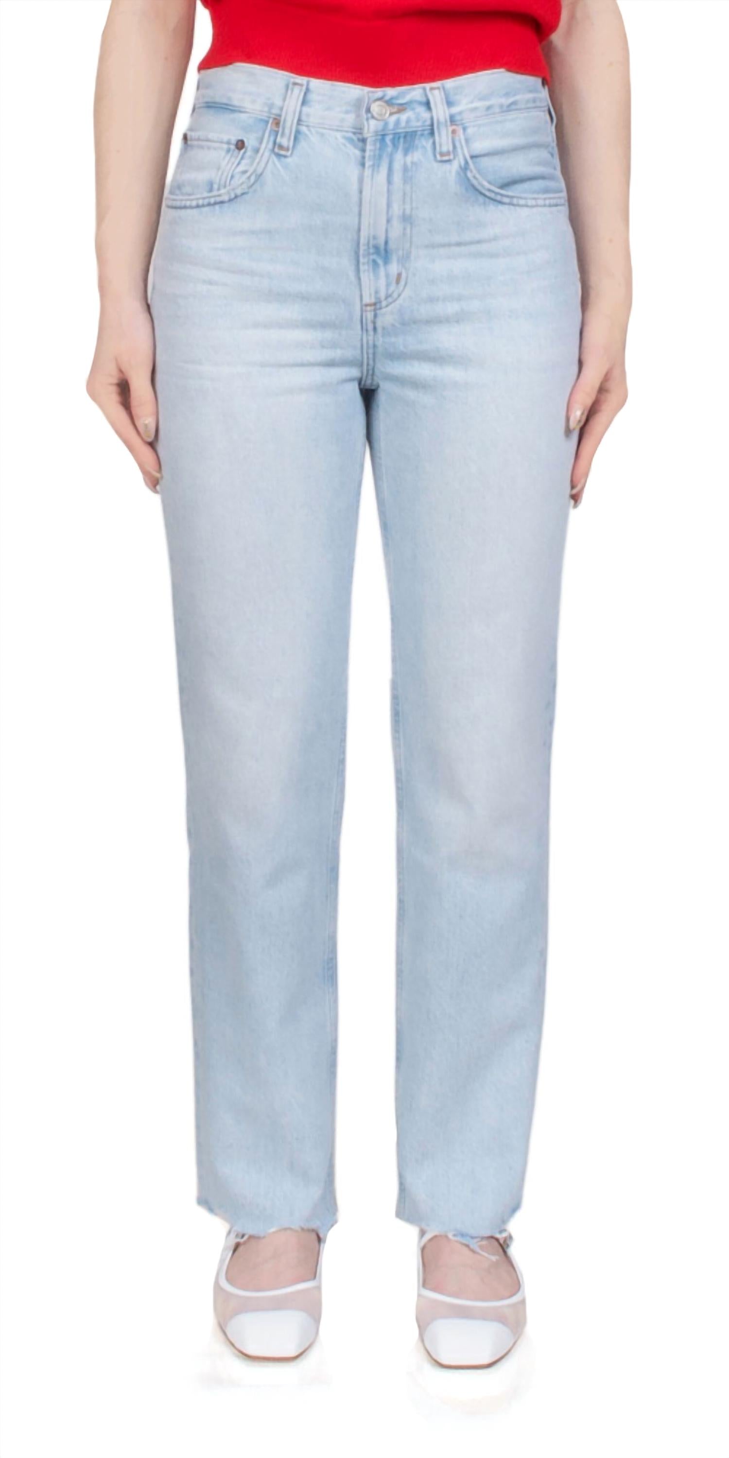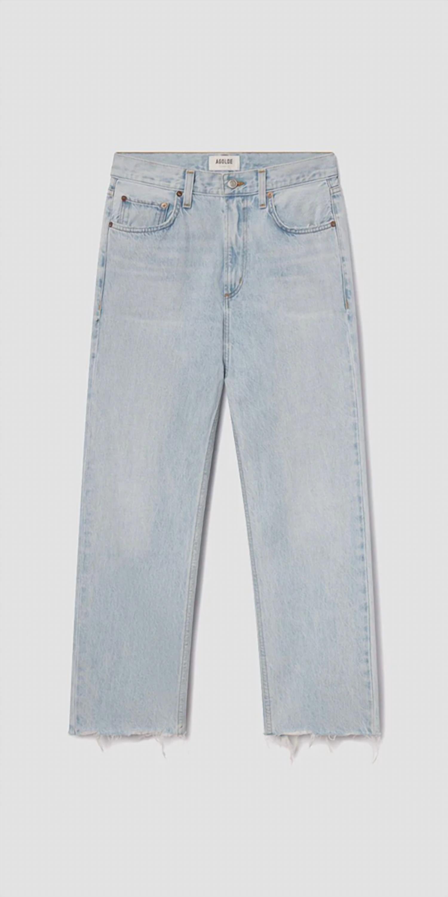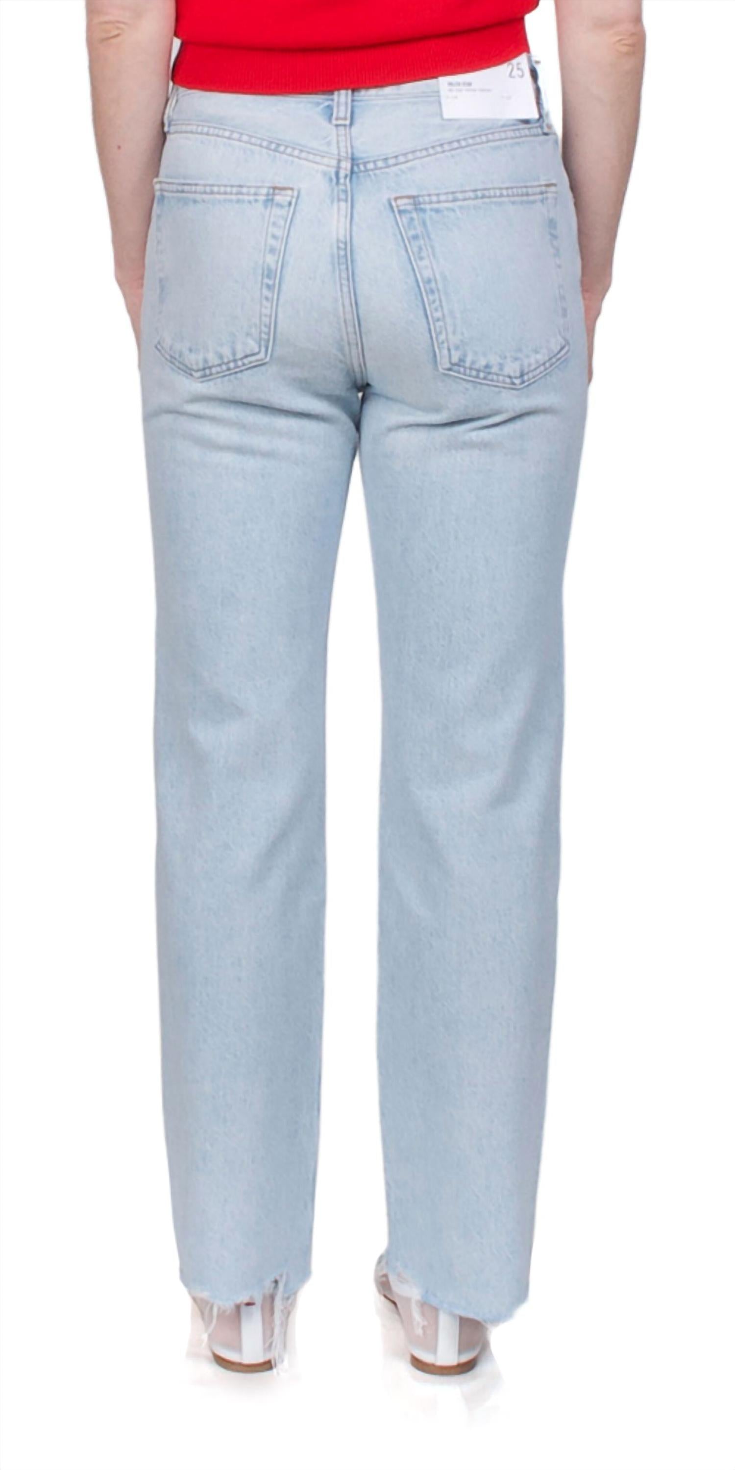 Introducing the Valen Jean Dual by AGOLDE, meticulously crafted for timeless style with a mid-rise and straight leg fit. Made from 100% regenerative cotton, these jeans feature a non-stretch, structured fit with a soft, lived-in feel. The light pale indigo denim showcases fading and whiskering for a vintage appeal, completed with a raw edge hem for added character. Closure is via a zipper fly, offering a practical wear, with a rise of 11", inseam of 28 1/2", and a leg opening of 15". Model is 5ft 5in and wears a size 25.