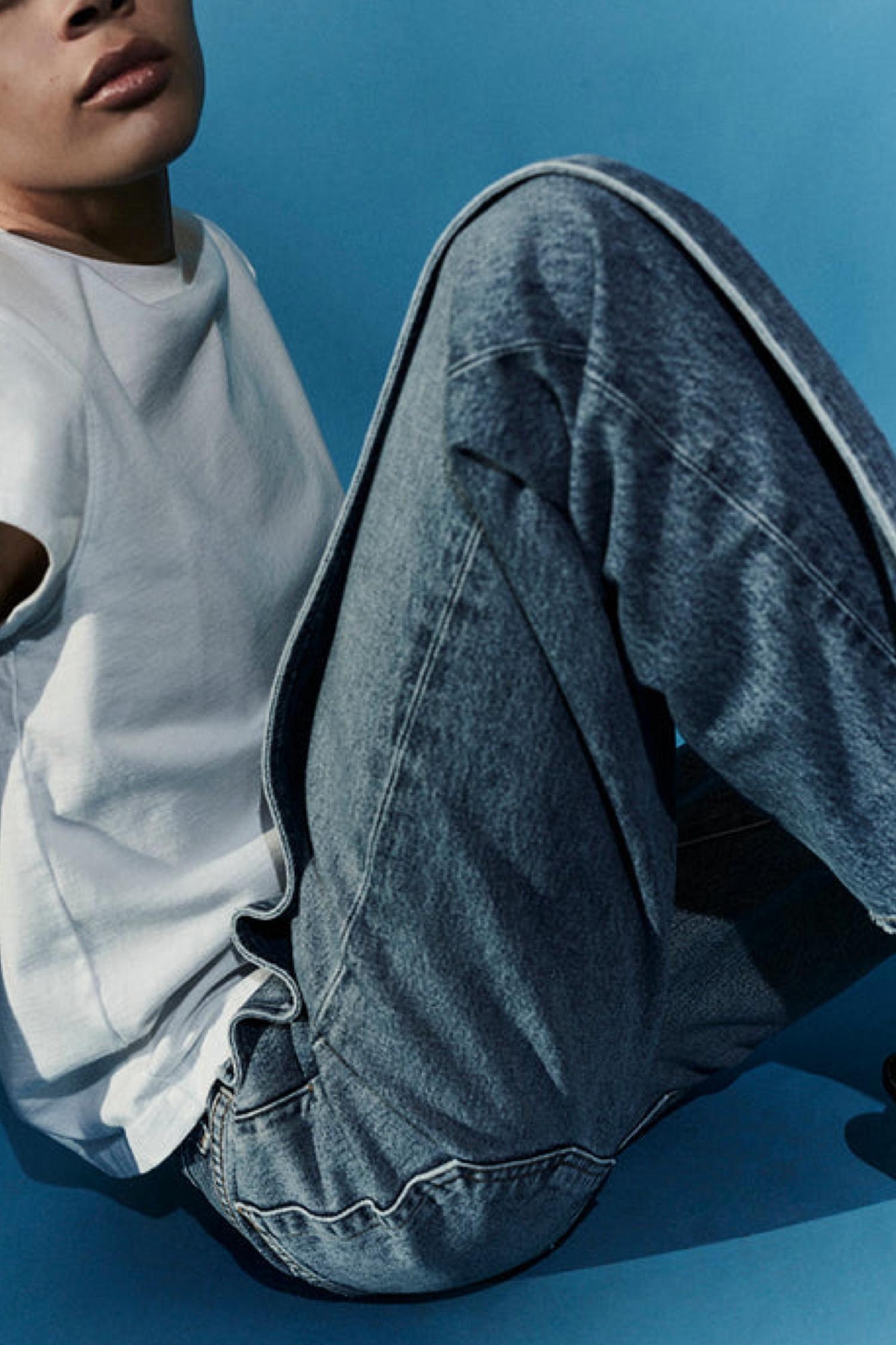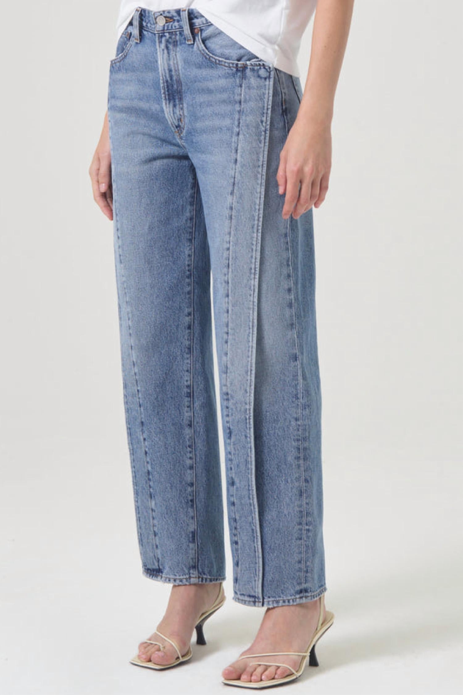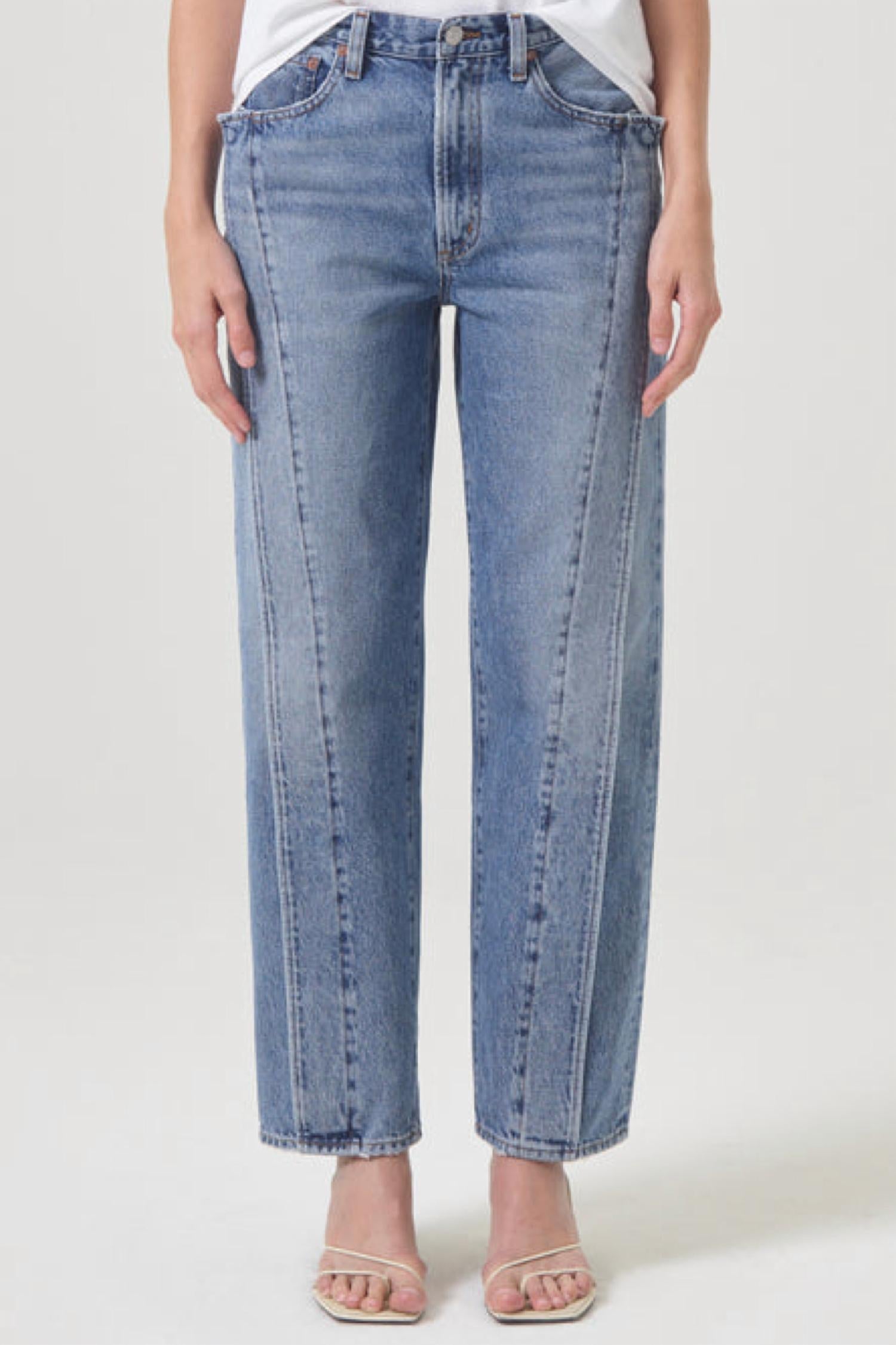 Elevate your streetwear wardrobe with the Women's Fold Jean by AGOLDE, crafted from 100% regenerative cotton and showcasing a textured pattern in a medium blue wash. These high-rise jeans feature a flattering loose silhouette that tapers to the ankle with a convenient zipper fly closure and center leg fold seams. Made in the USA with imported materials, they boast a spacious leg opening of 17", an 11 1/2" rise, and a 29" inseam, making them perfect for vacation-ready spring outings. Care is a breeze with machine wash cold inside out and tumble dry low instructions.